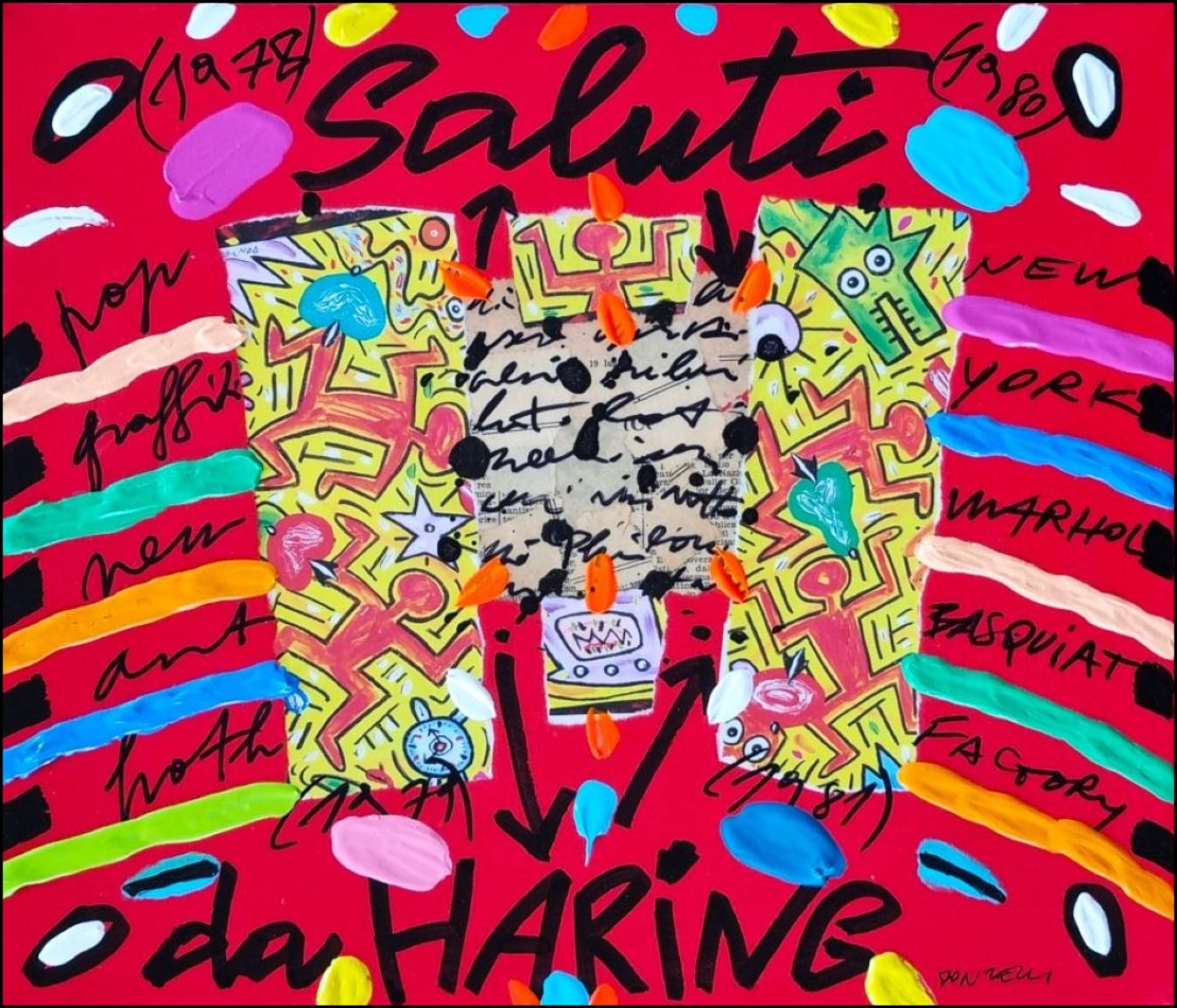 DONZELLI BRUNO Napoli 1941 "Saluti da Haring" Olio e tecnica mista su tela cm 35x30. Firmato sul fronte in basso a destra, al verso titolo e firma. Autentica su foto a cura del Maestro.