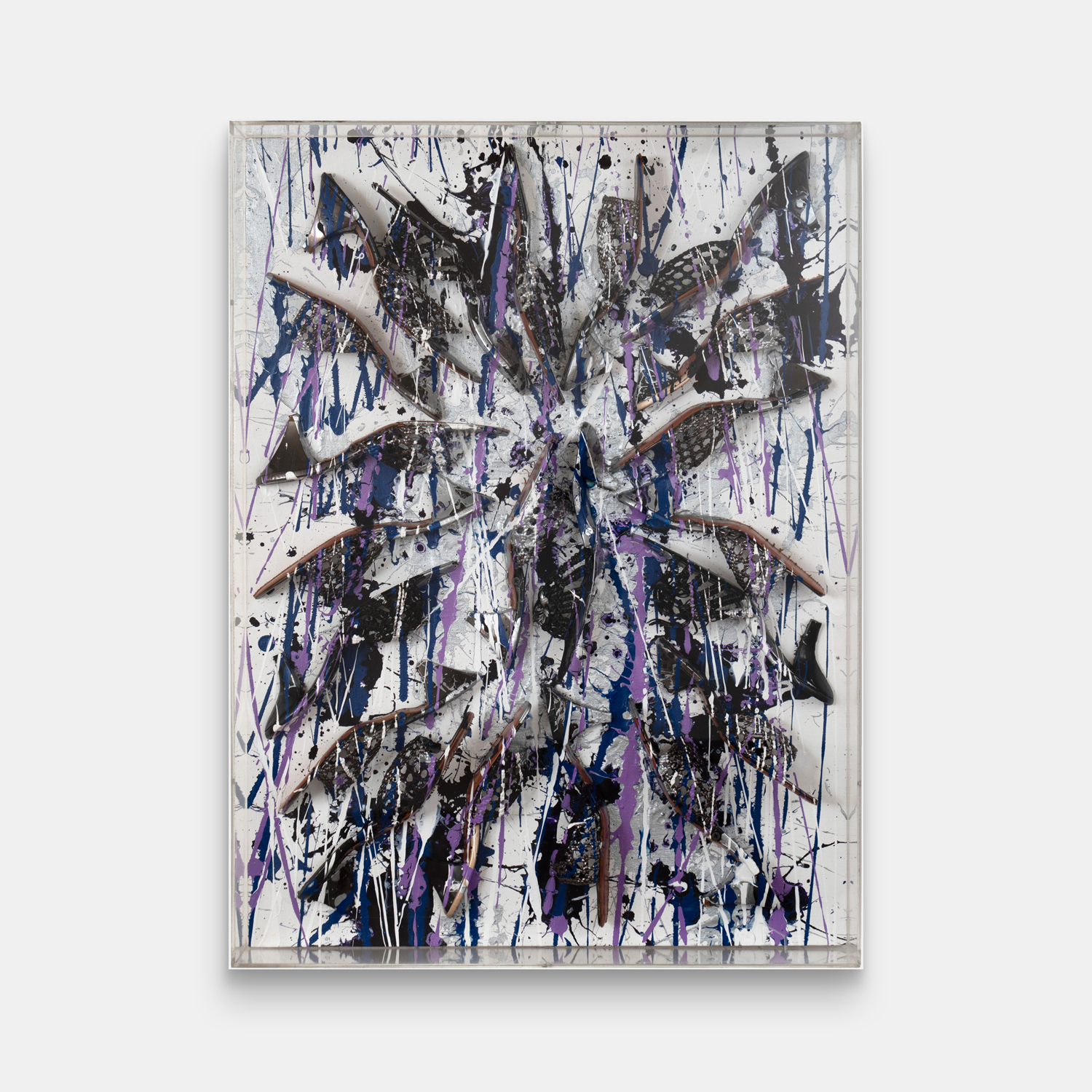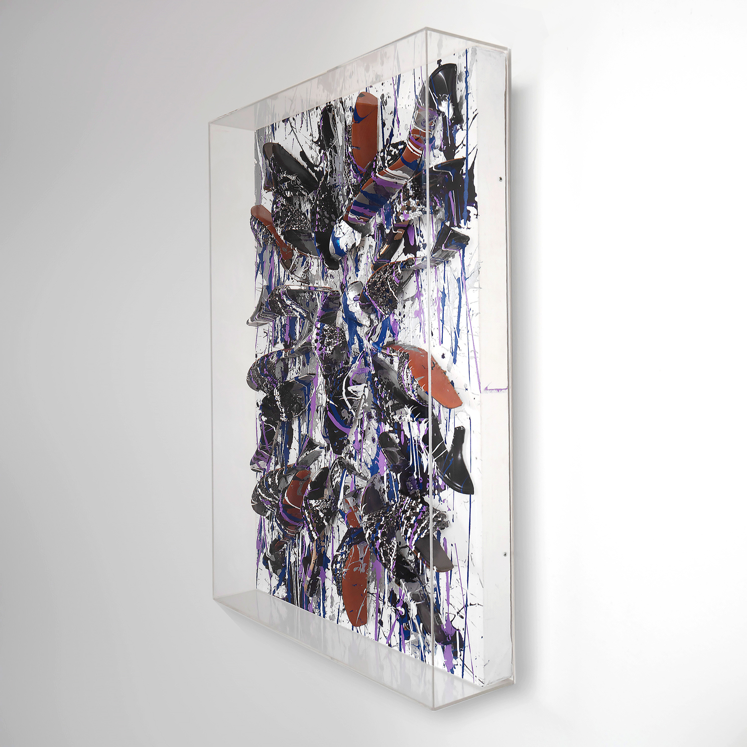 Accumulazione di sabot tagliati e tracce di colore su tela riportata su tavola