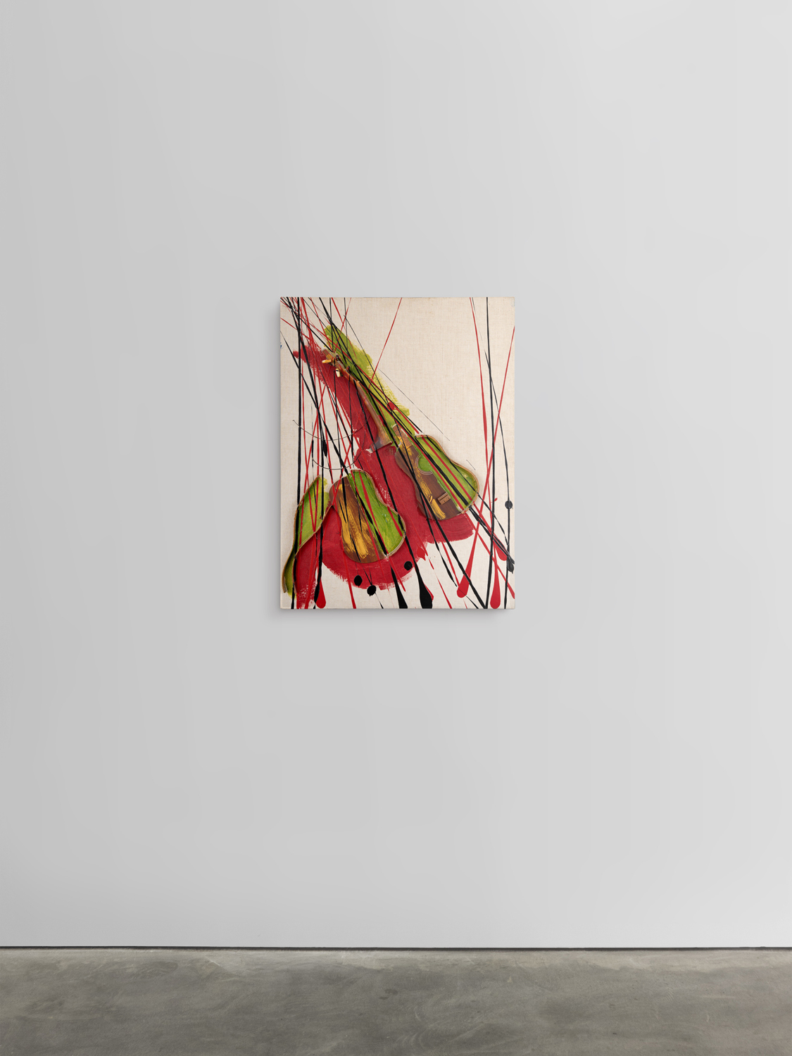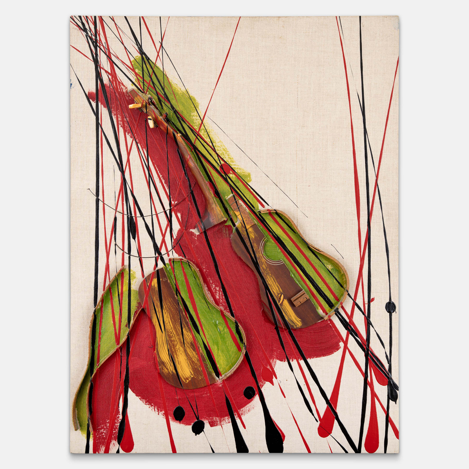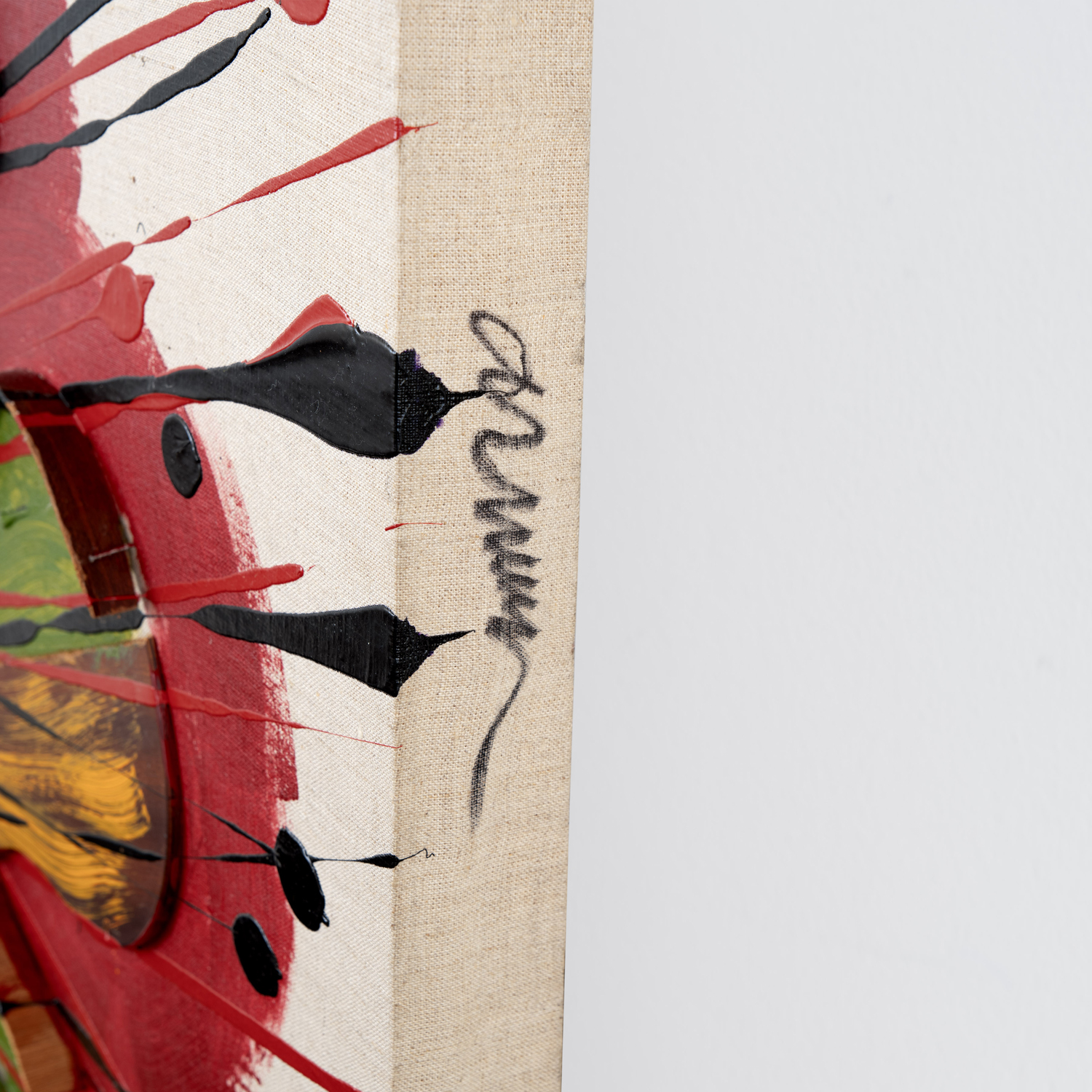 Ukulele tagliato e gettata di colori acrilici su tela riportata su tavola