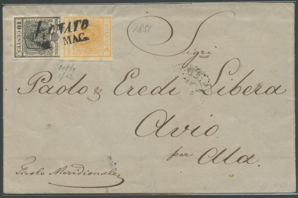 1851 - Lettera da Lonato per Avio affrancata per 15 centesimi tramite un 5c. Giallo arancio chiaro N.1f ed un 10c. Nero N.2. Molto interessante il difetto di clichè sulla scritta ''Centes'' del N.2. Cat. 1.500++ (Lux) (Colla)