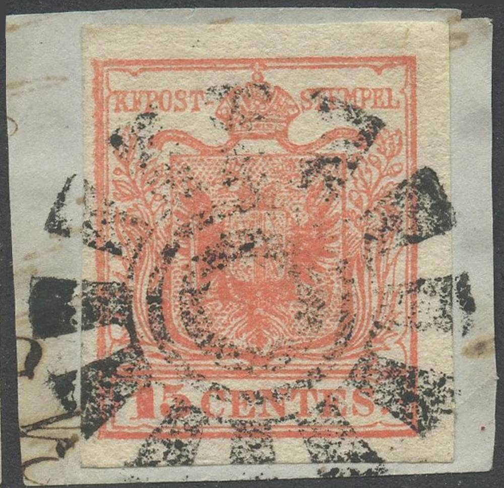 1850 - 15 cent. rosso vermiglio chiaro n.3f annullato tramite il Muto di Verona (11pt.)