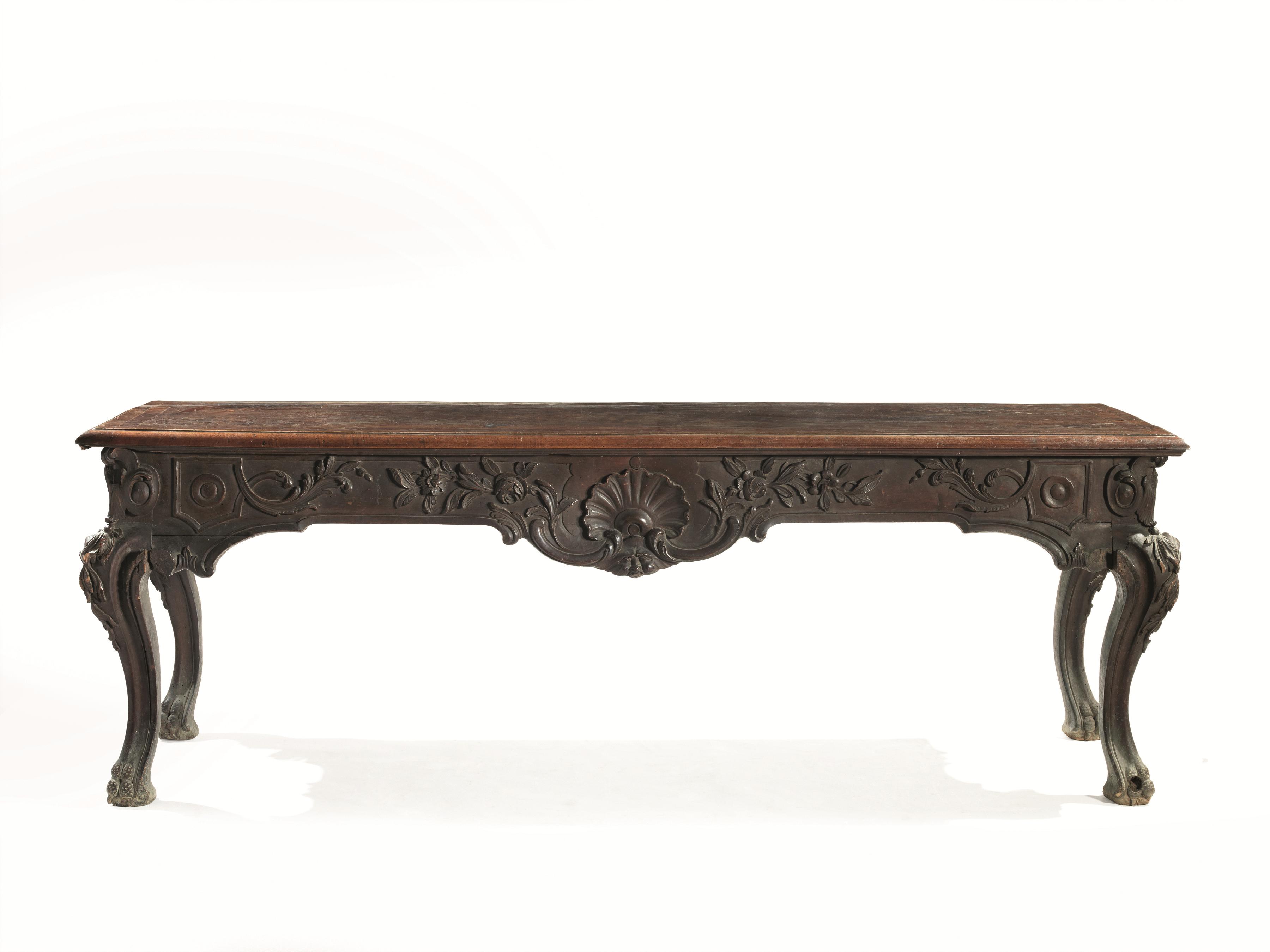 in noce a patina scura intarsiato e filettato in bosso, piano rettangolare con becco di civetta decorato da volute fitomorfe entro cornici geometriche, sostegno di epoca posteriore in legno dolce patinato a noce e intagliato a motivi floreali, fascia centrata da grande conchiglia, gambe sinuose su piedi a zoccolo stilizzato, cm 262x85x93, alcuni danni e restauri