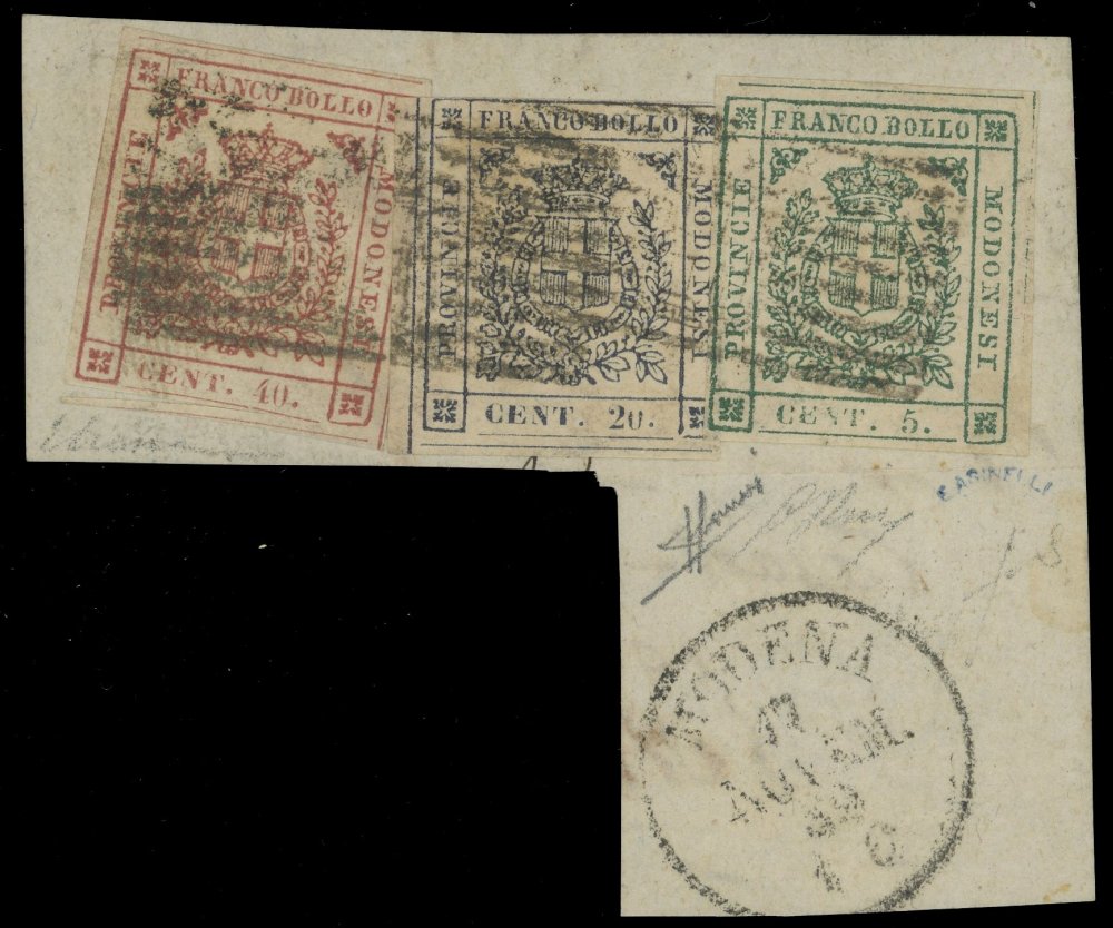 15.10.1859 - Frammento di lettera con rara affrancatura tricolore composta da 5 cent. verde n.12 + 20 cent. ardesia violaceo n.15 + 40 cent. carminio brunastro n.17c, tutti perfetti. Insieme non comune. (A) (Cert. Sorani, Emilio Diena per esteso, Oliva)