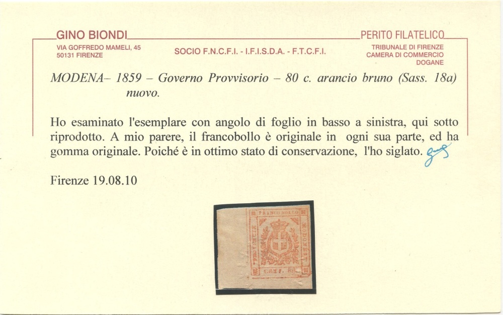 1859 - 80 cent. arancio bruno n.18a nuovo con gomma, linguellato. Angolo di foglio inferiore sinistro. Cat. 350++. (LUX)