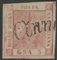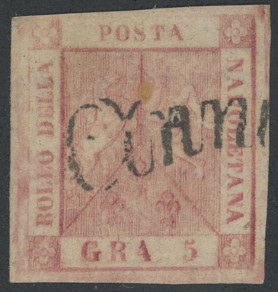 1858 - 5 gr. carminio rosa II tav. n.9i, usato tramite annullo a ''svolazzo'' e con filigrana lettere ''BOLLI POSTALI''. Rasente in alto a sinistra. (A-)