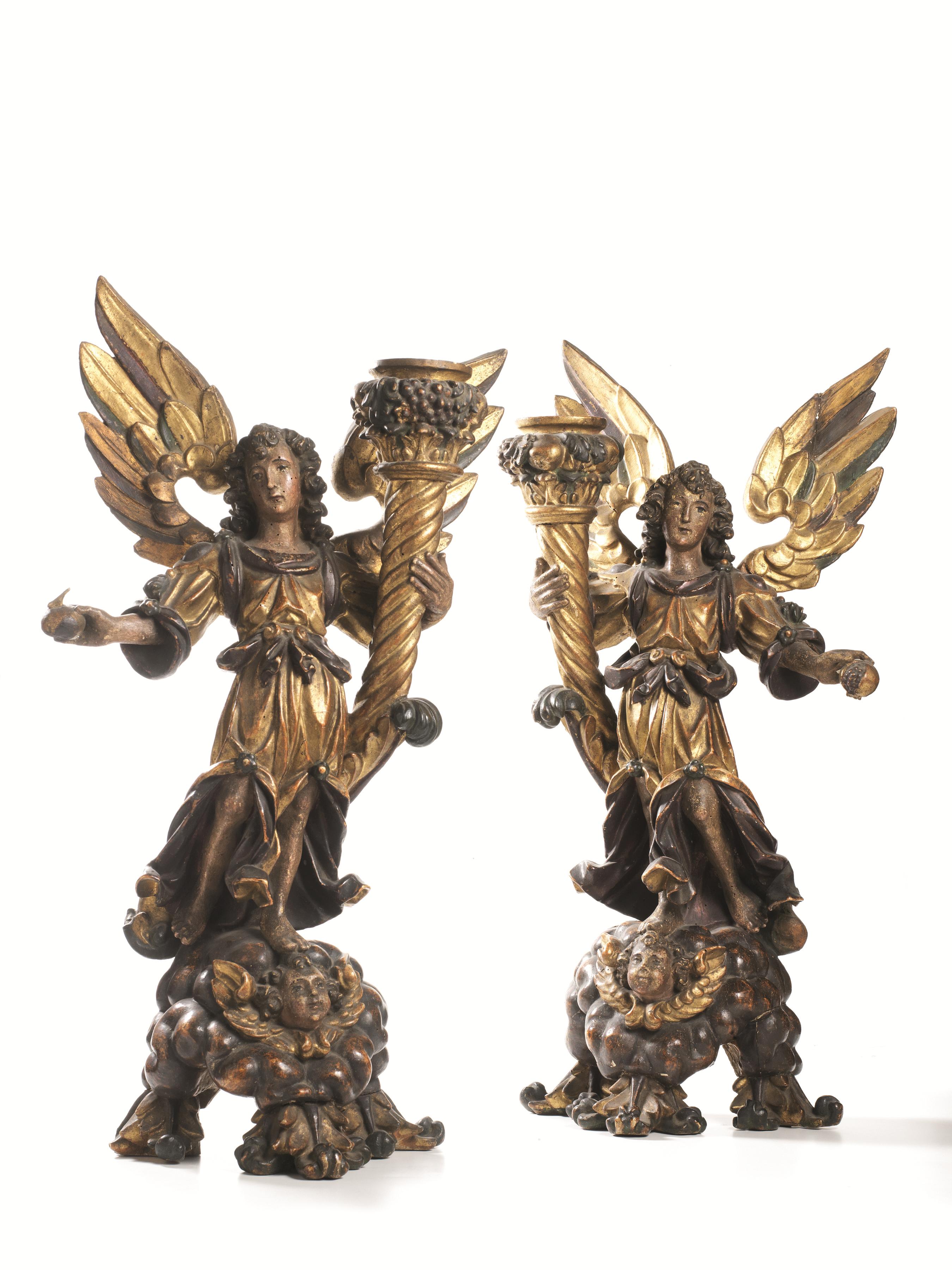 COPPIA DI ANGELI REGGI CERO, SECOLO XVIIin legno intagliato, scolpito e...