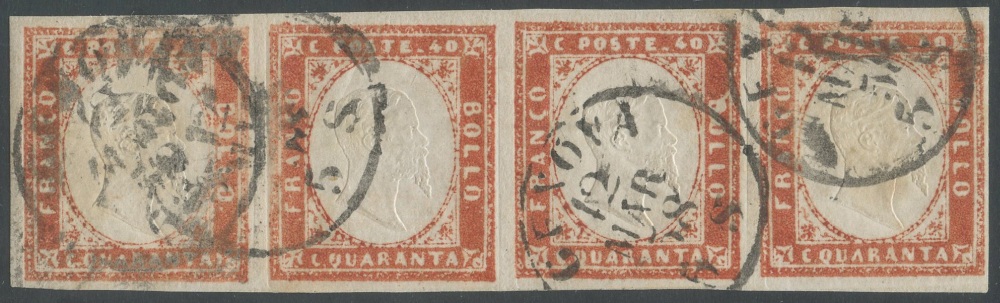 Sardegna - 40 cent. vermiglio arancio scuro in striscia di 4