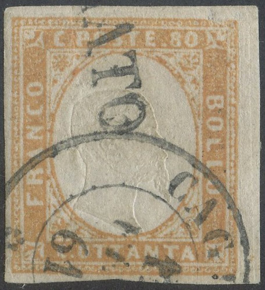 1858 - 80 cent. bistro arancio (chiarissimo) usato tardivamente a Cagliari nel 1861. Punto chiaro nel margine superiore. (A-)