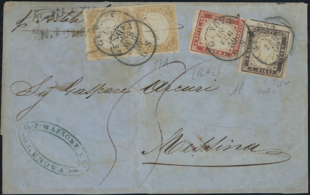 18.02.1859 - Busta da Genova per Messina affrancata in tariffa di triplo porto da 2,10 lire tramite un 10 cent. bruno porpora n.14Ac, 40 cent. rosso scarlatto n.16A e una coppia da 80 cent. giallo ocra pallido n.17A. Insieme molto raro. Cat. 26.400 euro.