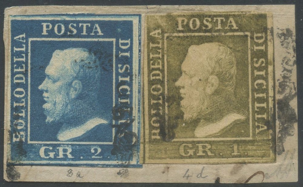 1859 - 1 gr. oliva II tav. carta di Napoli n.4d + 2 gr. azzurro vivo III tav. carta di napoli n.8c, conservati su frammento di lettera. Splendido insieme. Cat. 1075. (A-)