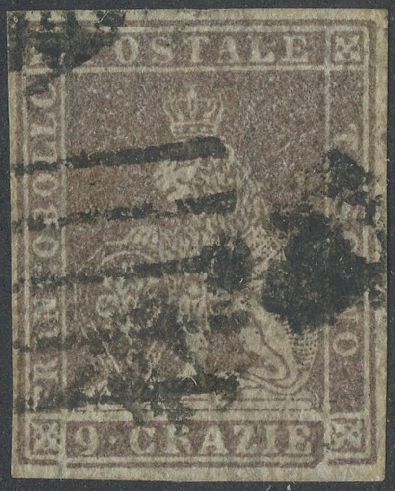 1859 - 9 cr. bruno lillaceo con filigrana a linee ondulate n. 16, usato e di ottima qualità. Il raro esemplare è accompagnato da due certificati Vaccari e Enzo Diena. Molto raro così ben marginato. Cat. 12.000 euro. (A+) (Cert. Vaccari, Cert. Enzo Diena, Alberto Diena)