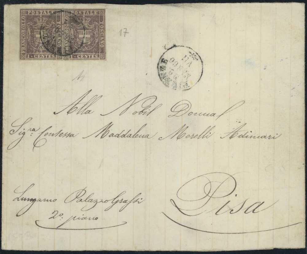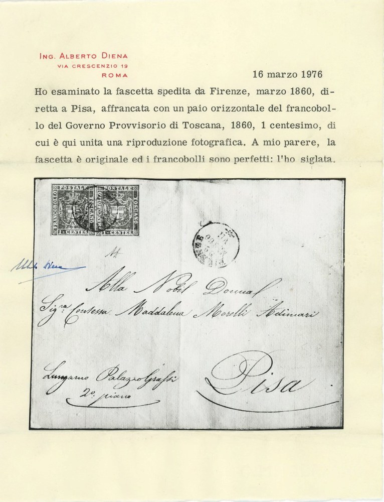 1860 - Fascetta spedita da Firenze per Pisa ed affrancata per 2 centesimi tramite una coppia del 1 cent. violetto bruno n.17. Insieme molto fresco e francobolli con grandi margini. Insieme non comune in questo stato di conservazione. Cat. 9.000 euro++. (A+) (Cert. Alberto Diena)