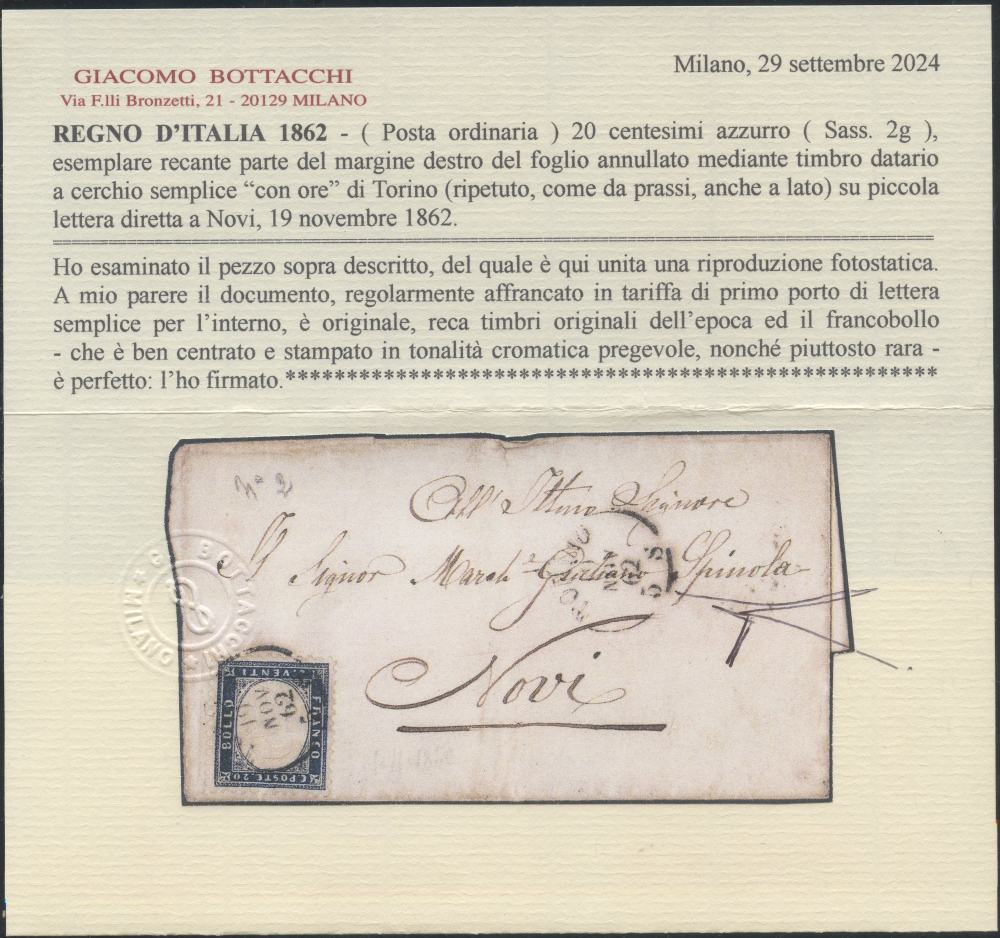 1862 - 20 cent. azzurro n.2g su lettera, bordo di foglio a destra. Cat. 20.000++. (A+) (Cert. Bottacchi)