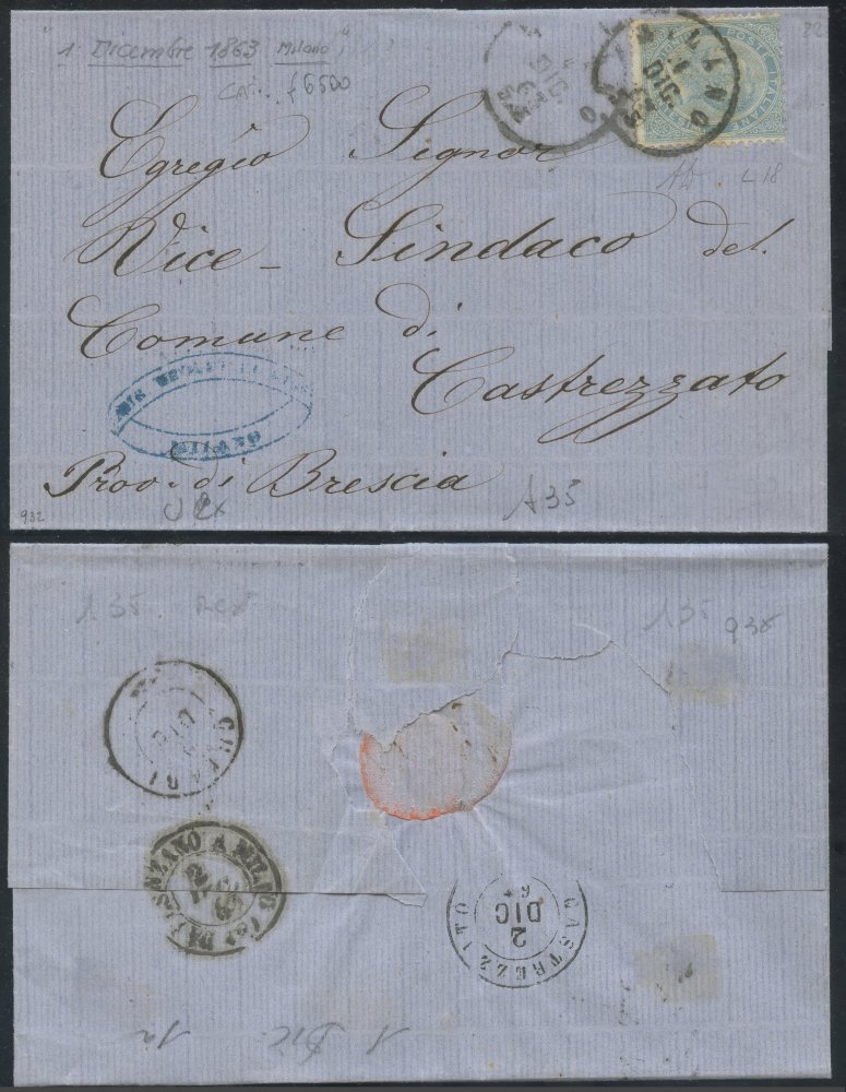 01.12.1863 - Lettera spedita da Milano per Castrezzato ed affrancata tramite un 15 cent. De La Rue n. L.18. Rara e ben conservata. Siglata Alberto Diena.