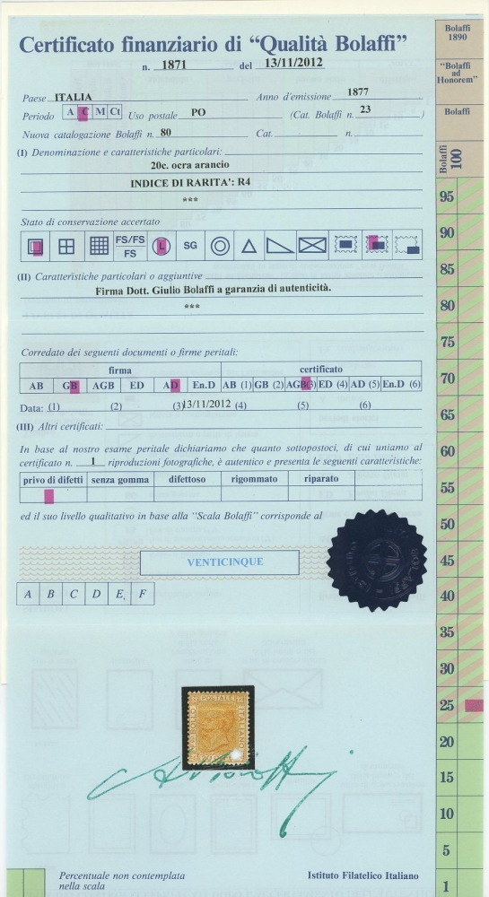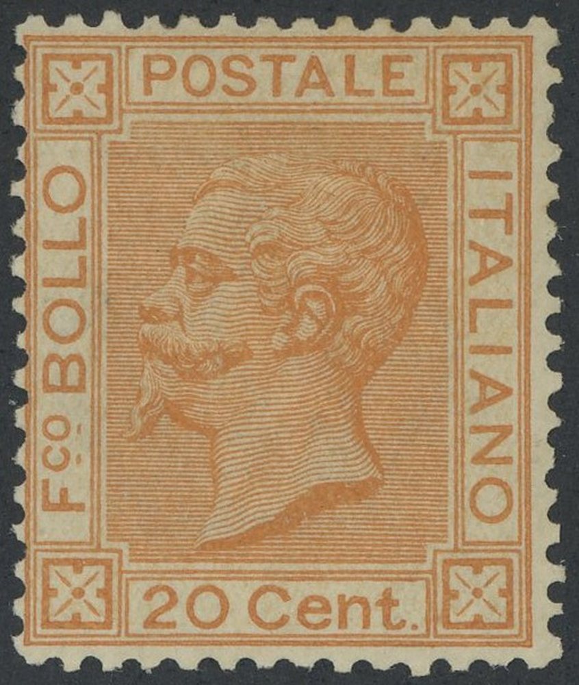 1877 - 20 cent. arancio n.28 nuovo con gomma originale con discreta centratura, perfetto. Certificato finanziario Bolaffi. Cat. 8.500 euro.