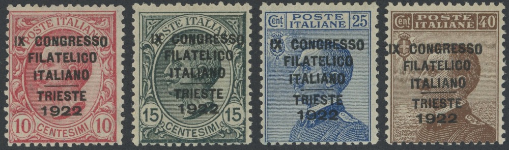 1922 - Congresso Filatelico di Trieste, n.123/126 nuovi con invisibile traccia di linguella MH. Centratura decisamente superiore alla media, serie non comune in questo splendido stato di conservazione. Firme di Alberto Diena. Cat. 4.500++.