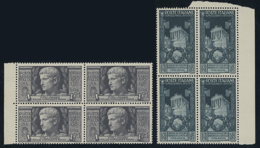 1937 - Augusto, la serie comprensiva della Posta Aerea n. 416/425 + A106/A110, in quartine nuove con gomma integra. Qualità mista.