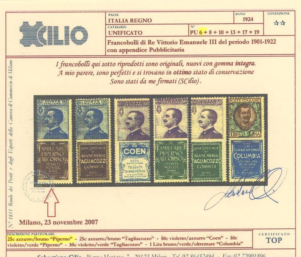 1924 - 25 cent. Piperno n.6, nuovo con gomma integra MNH. Fotocopia del certificato Cilio della serie di provenienza.