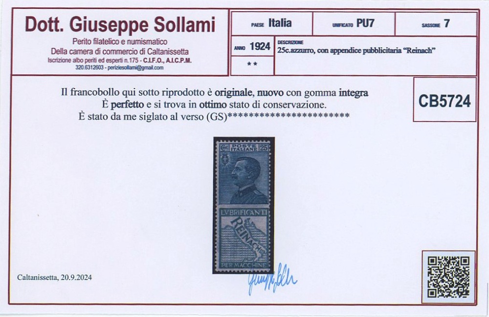 1924 - 25 cent. Reinach n.7, nuovo con gomma integra MNH. Certificato Sollami.