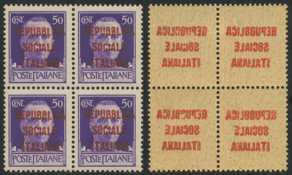 1944 - 50 cent. Tiratura di MILANO con soprastampa in ROSSO BRUNO, blocco di quattro nuovo con gomma integra. Al retro nitido decalco per tutti i valori.