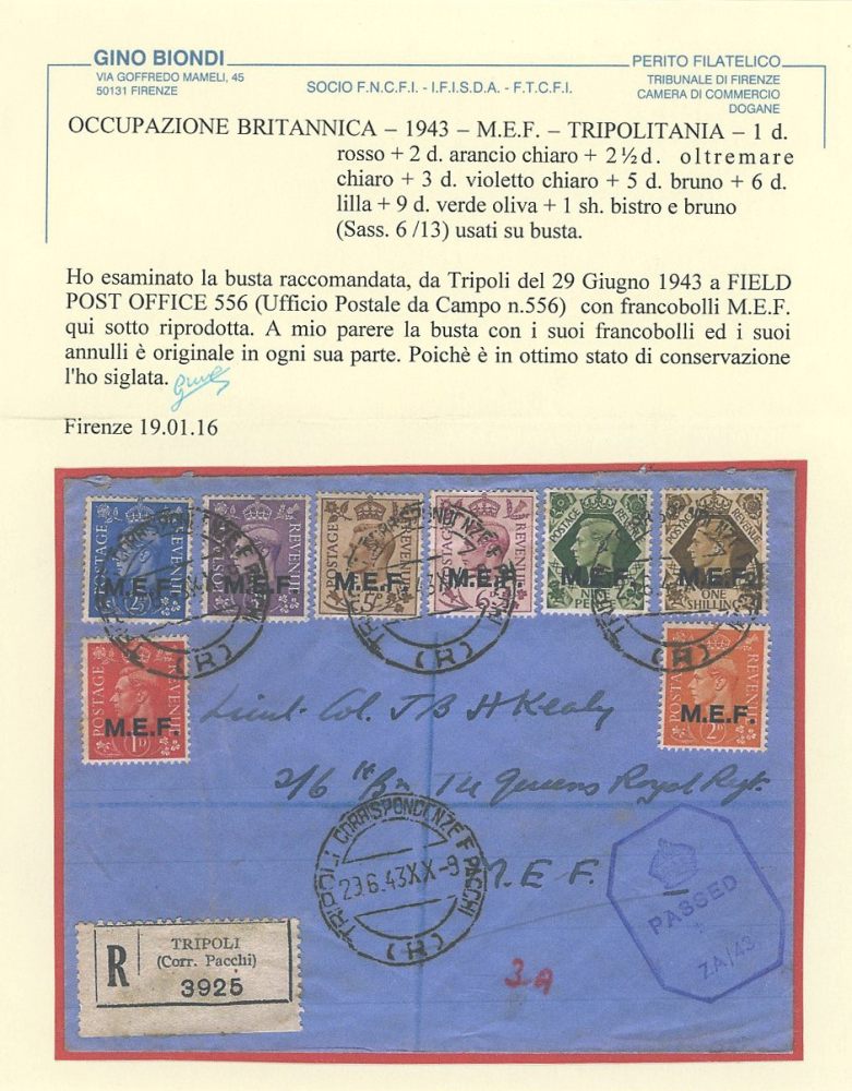 1943 - M.E.F. n.6/13 su busta raccomandata da Tripoli per Field Post Office 556. Certificato Biondi.