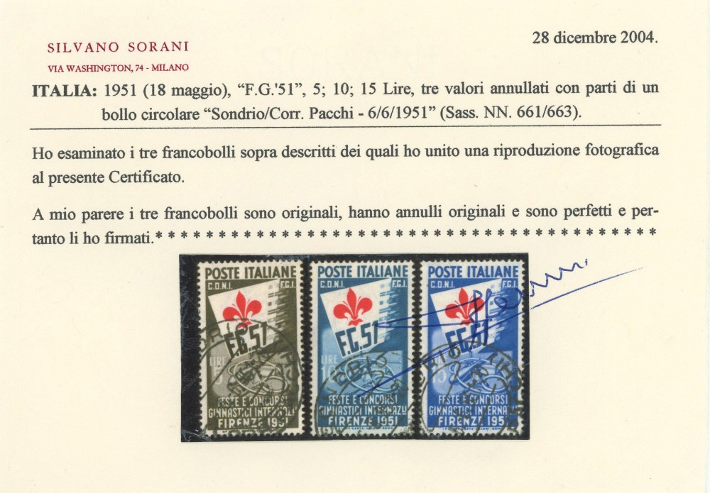 1951 - Ginnici, n. 661/663 usati con nitidi annulli originali. Certificato Sorani.