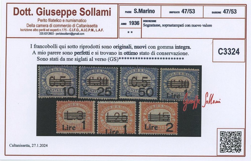 1936 - Soprastampati con nuovo valore n.47/53, nuovi con gomma integra MNH. Certificato Sollami.