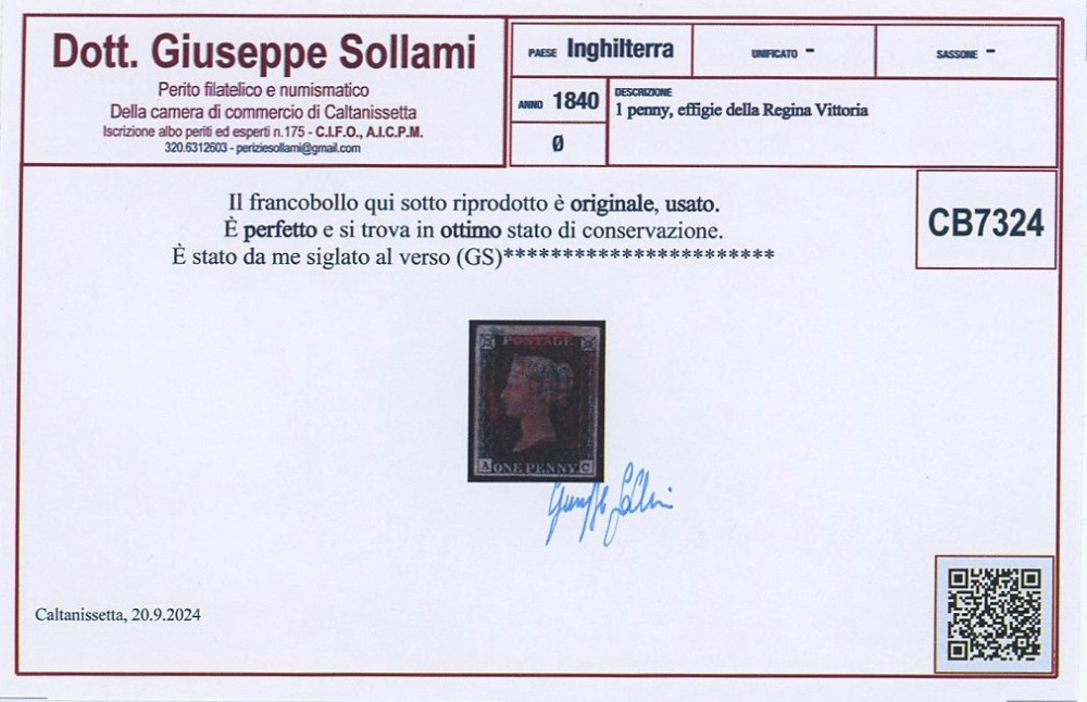 1840 - 1 penny nero n.1 ''Penny Black'' con margini molto grandi e ben conservato. Certificato Sollami.