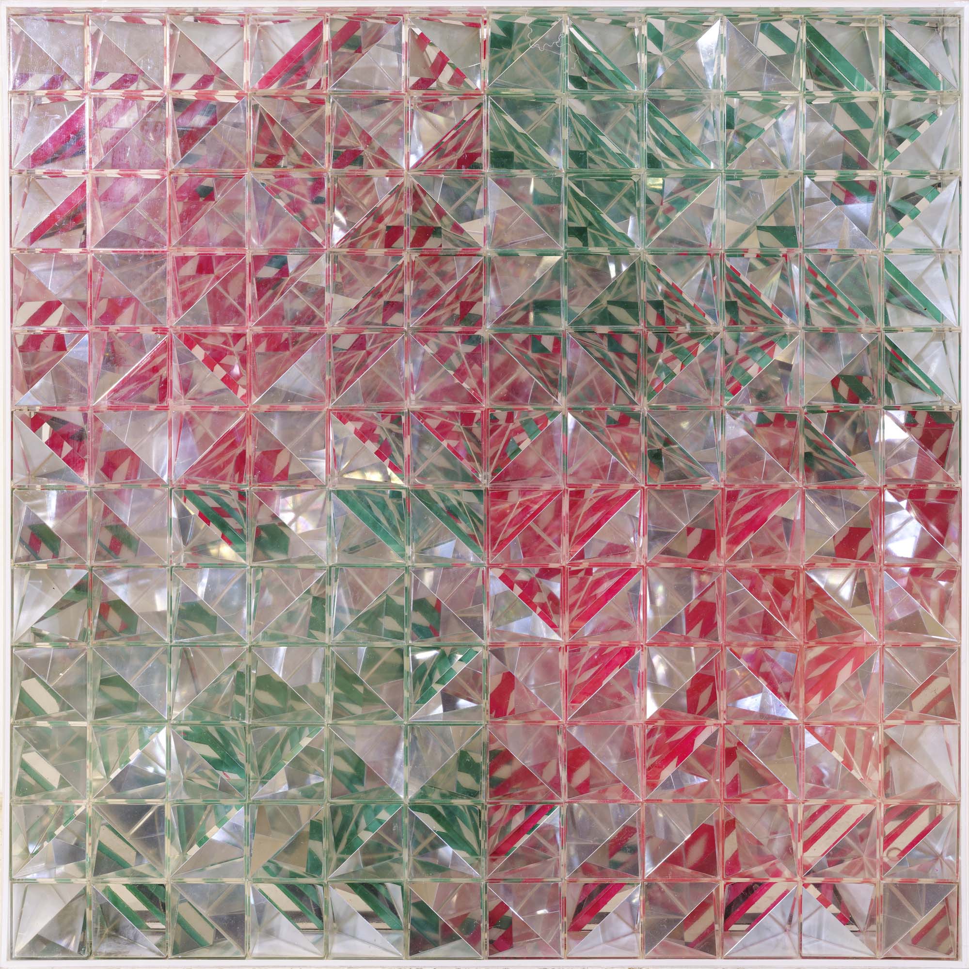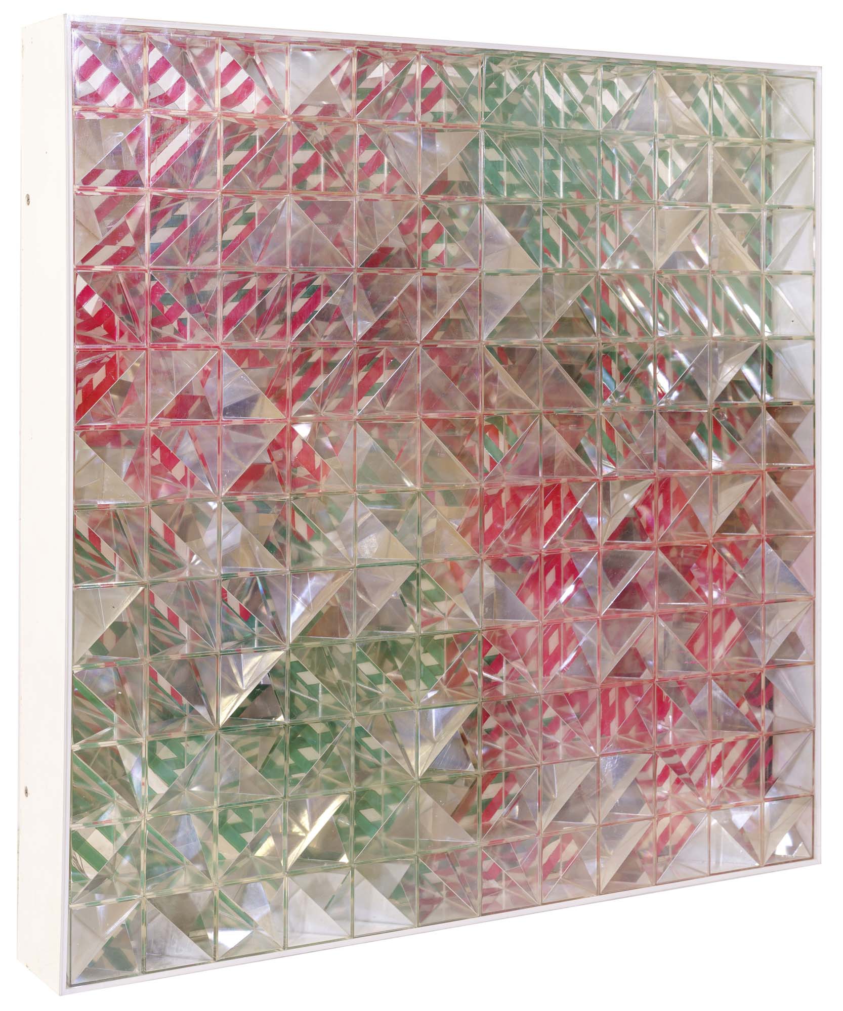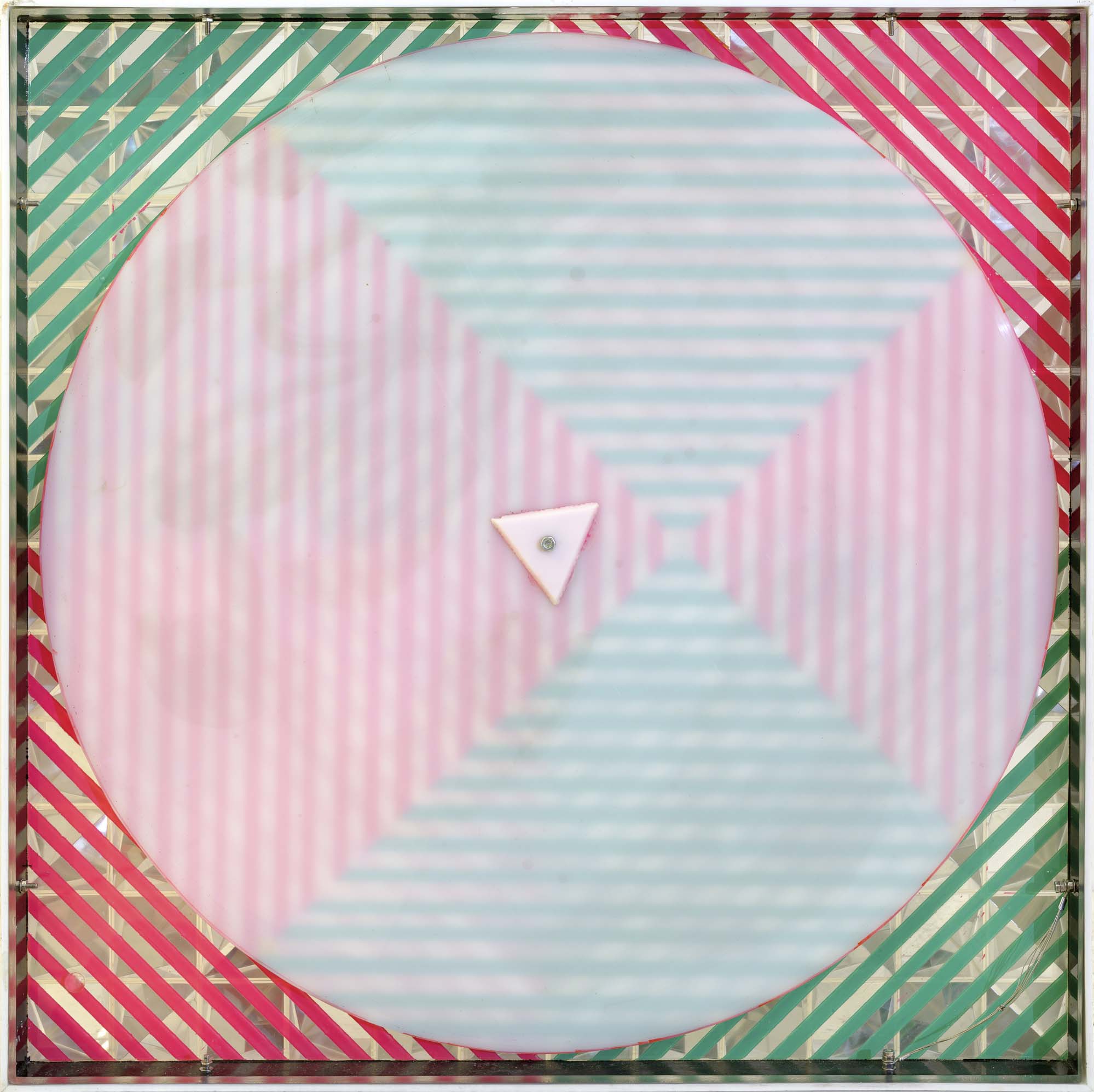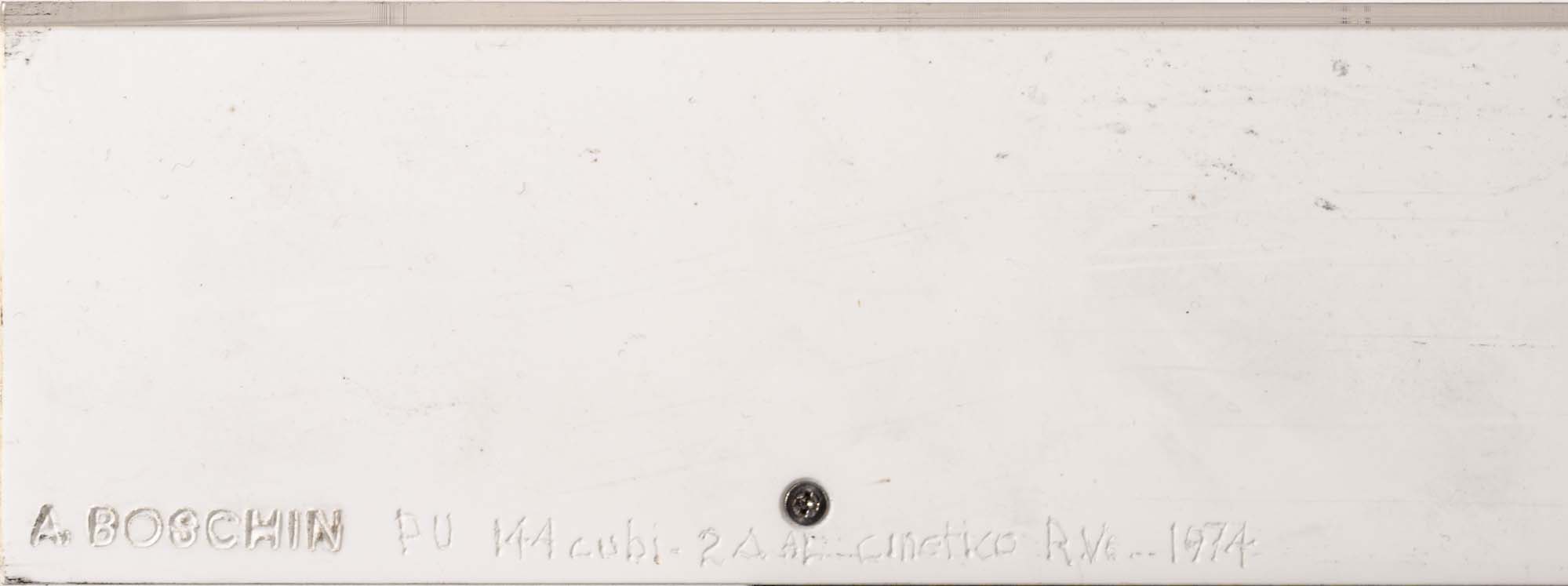144 cubi + cerchio rotante su plexiglass dipinto entro teca in perspex cm. 54x54x7