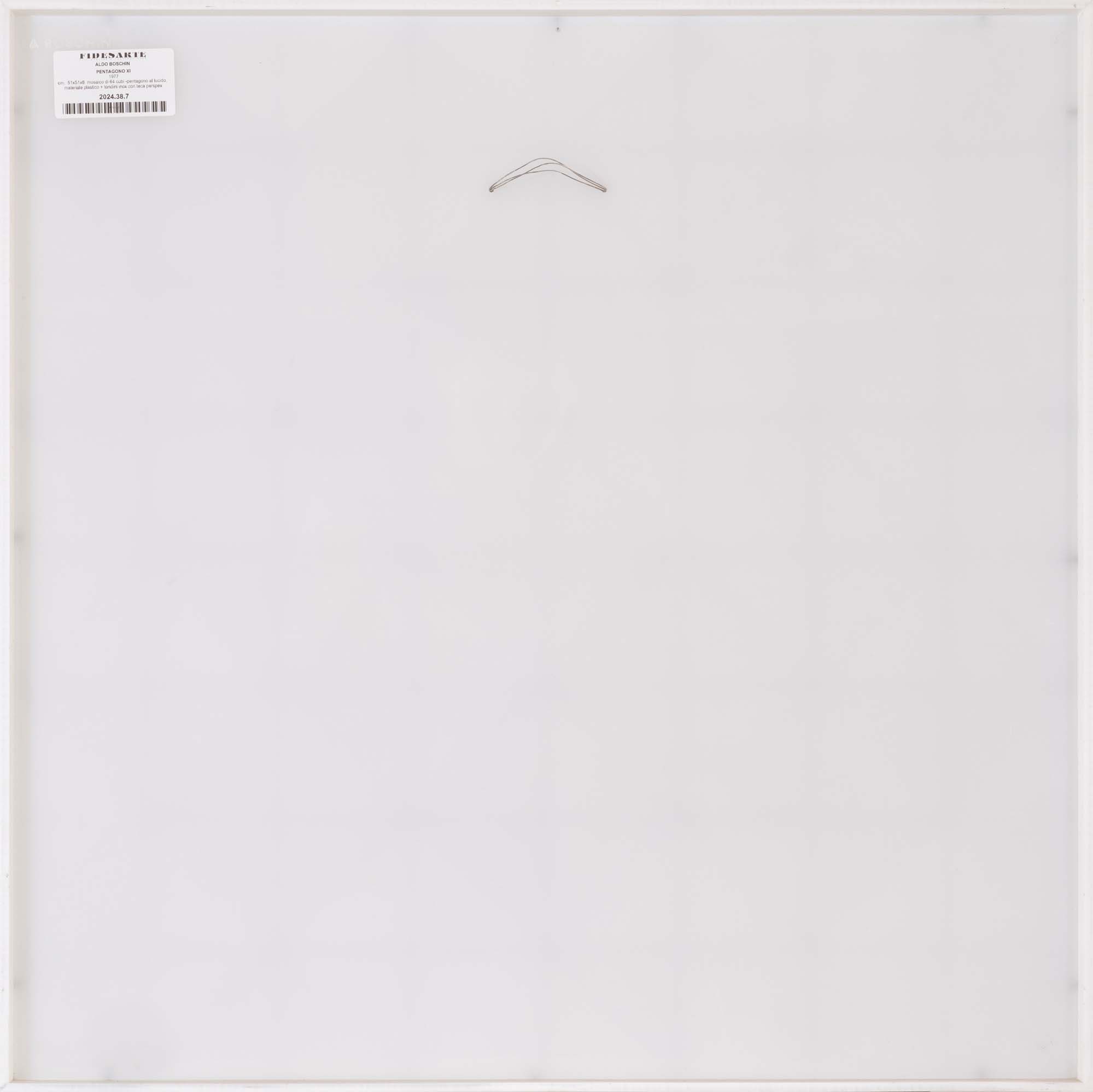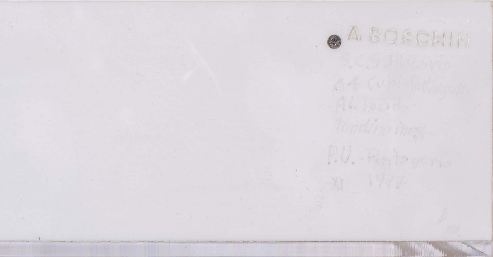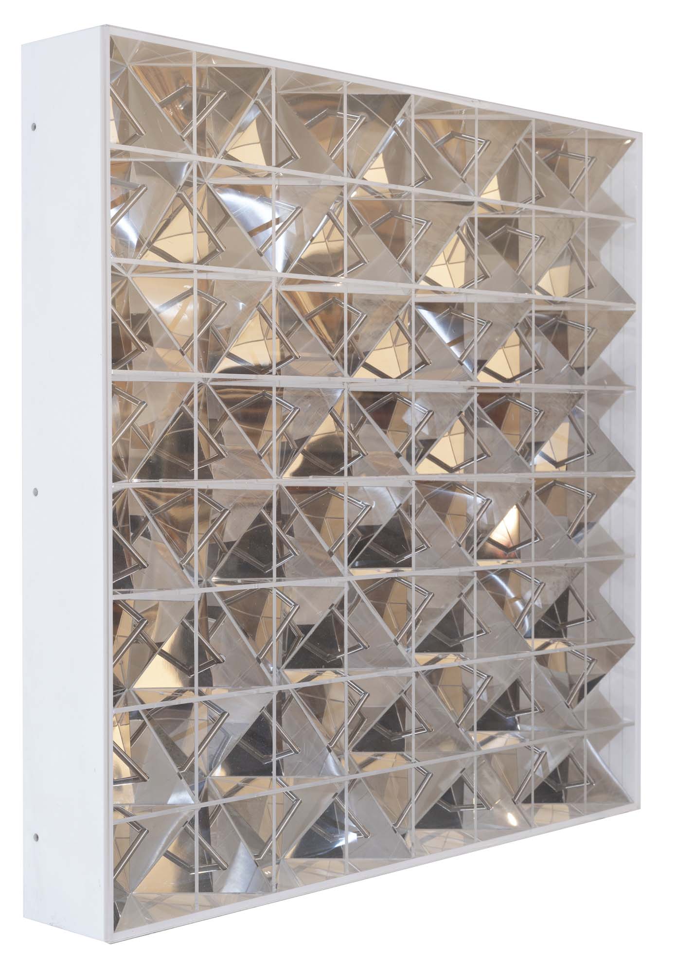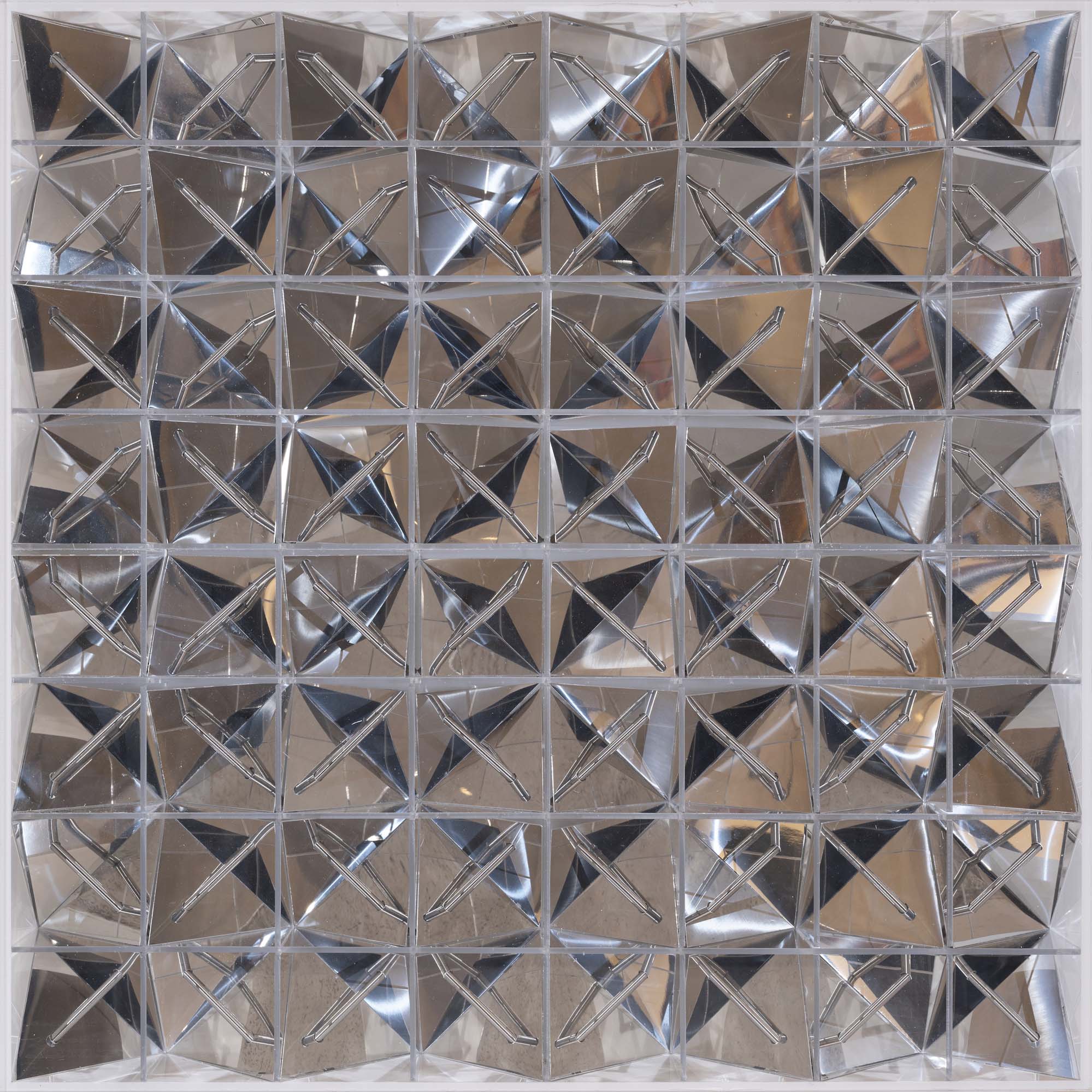 mosaico di 64 cubi - pentagono al lucido, materiale plastico + tondini inox entro teca in perspex cm. 51x51x8