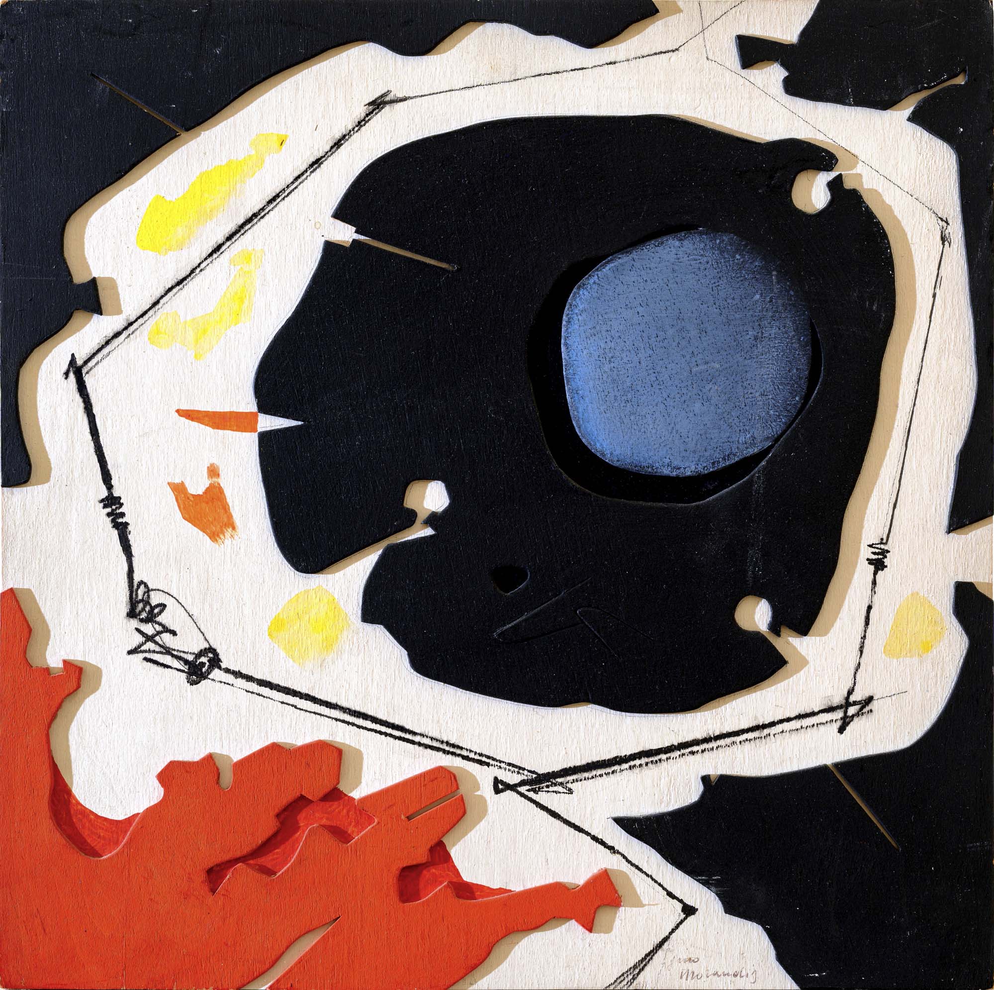olio, grafite e collage di legni riportati su tavola cm. 30x30x6