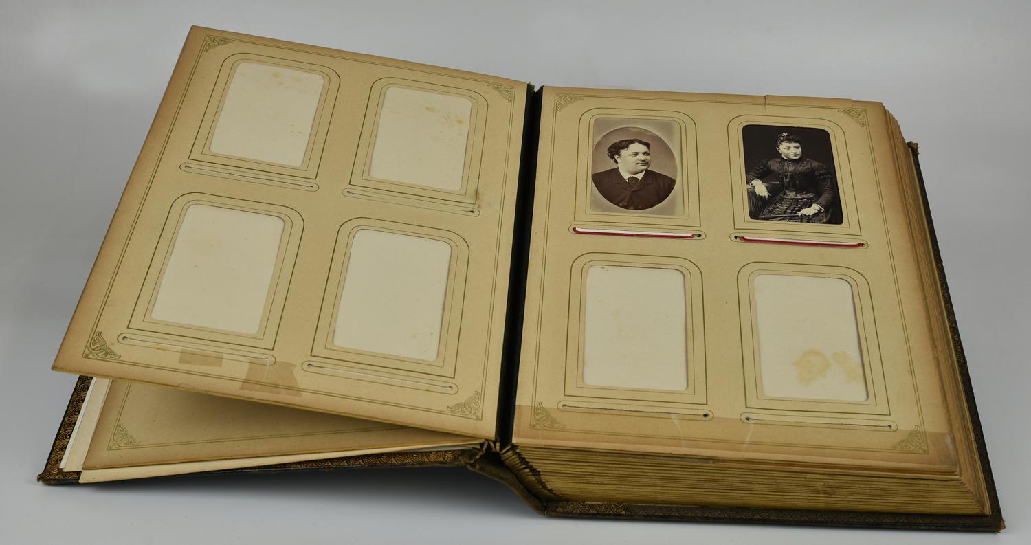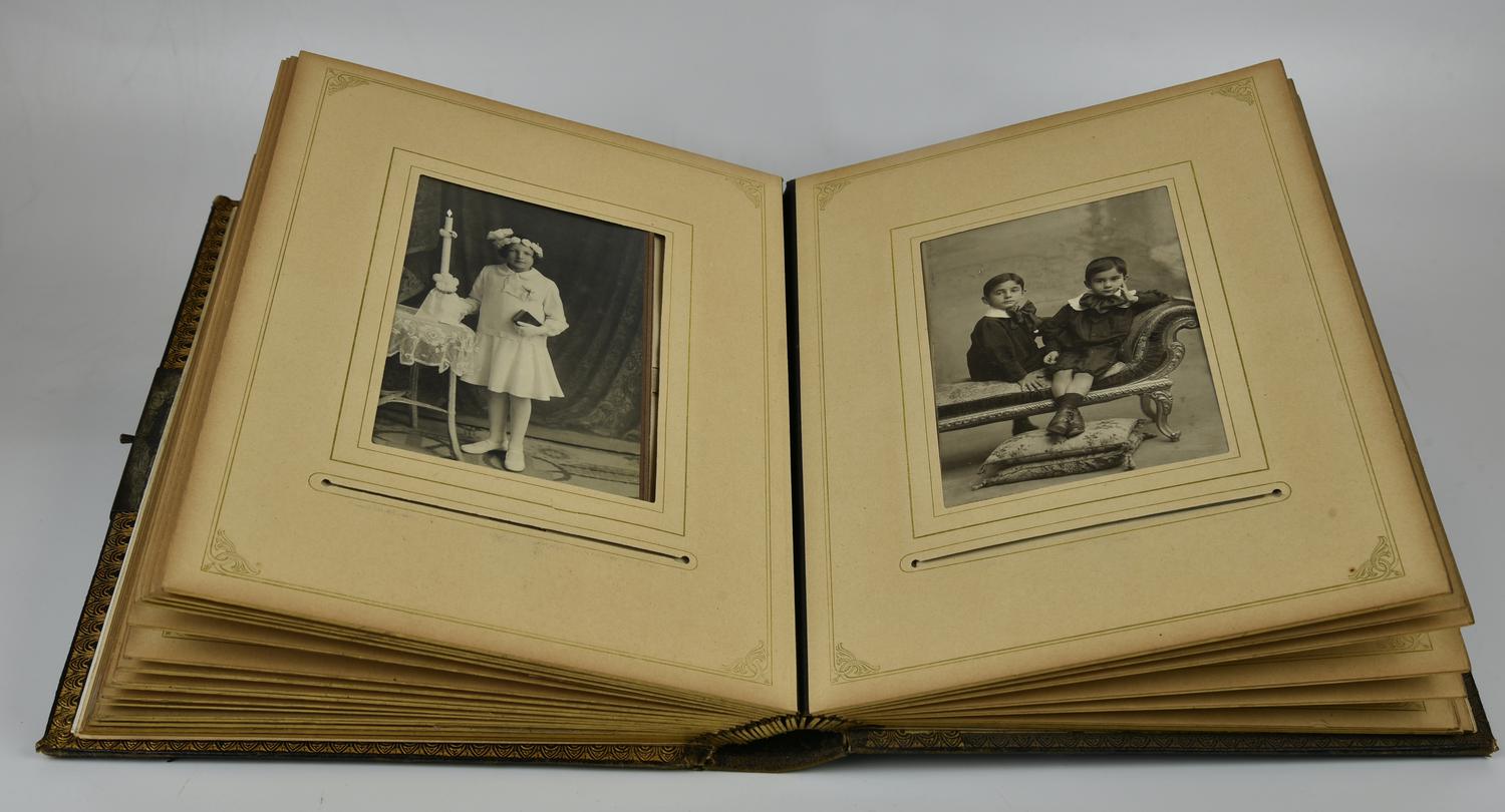 ALBUM FOTOGRAFICO rilegatura in pelle con inserti in metallo argentato e...