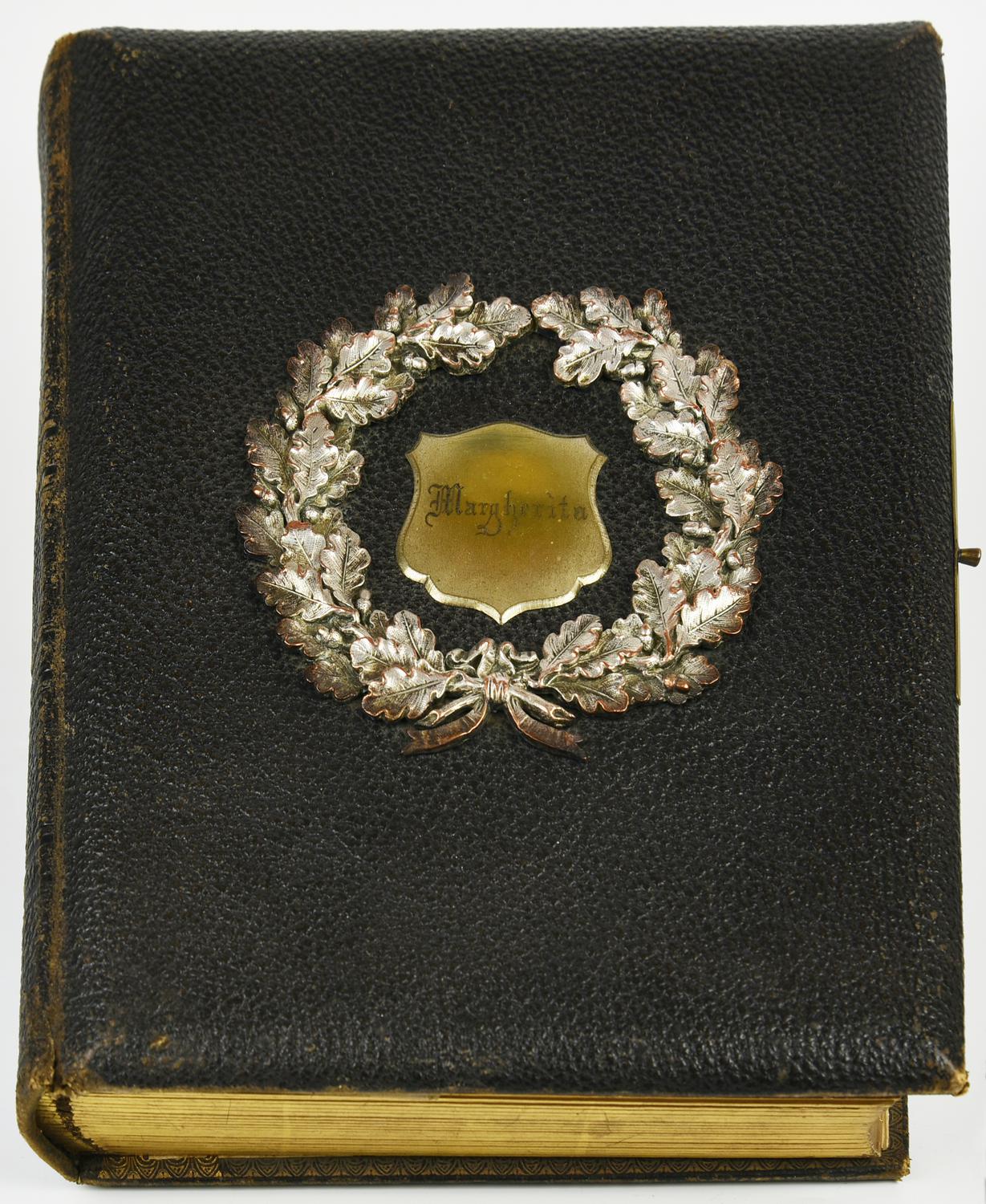 rilegatura in pelle con inserti in metallo argentato e stemma sul fronte con incisione riportante il nome Margherita, cm 28x22,5