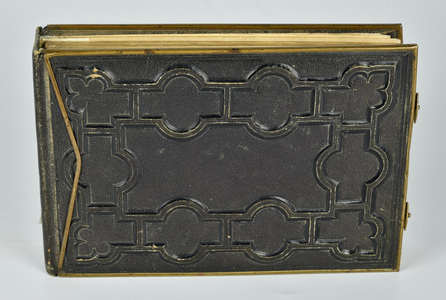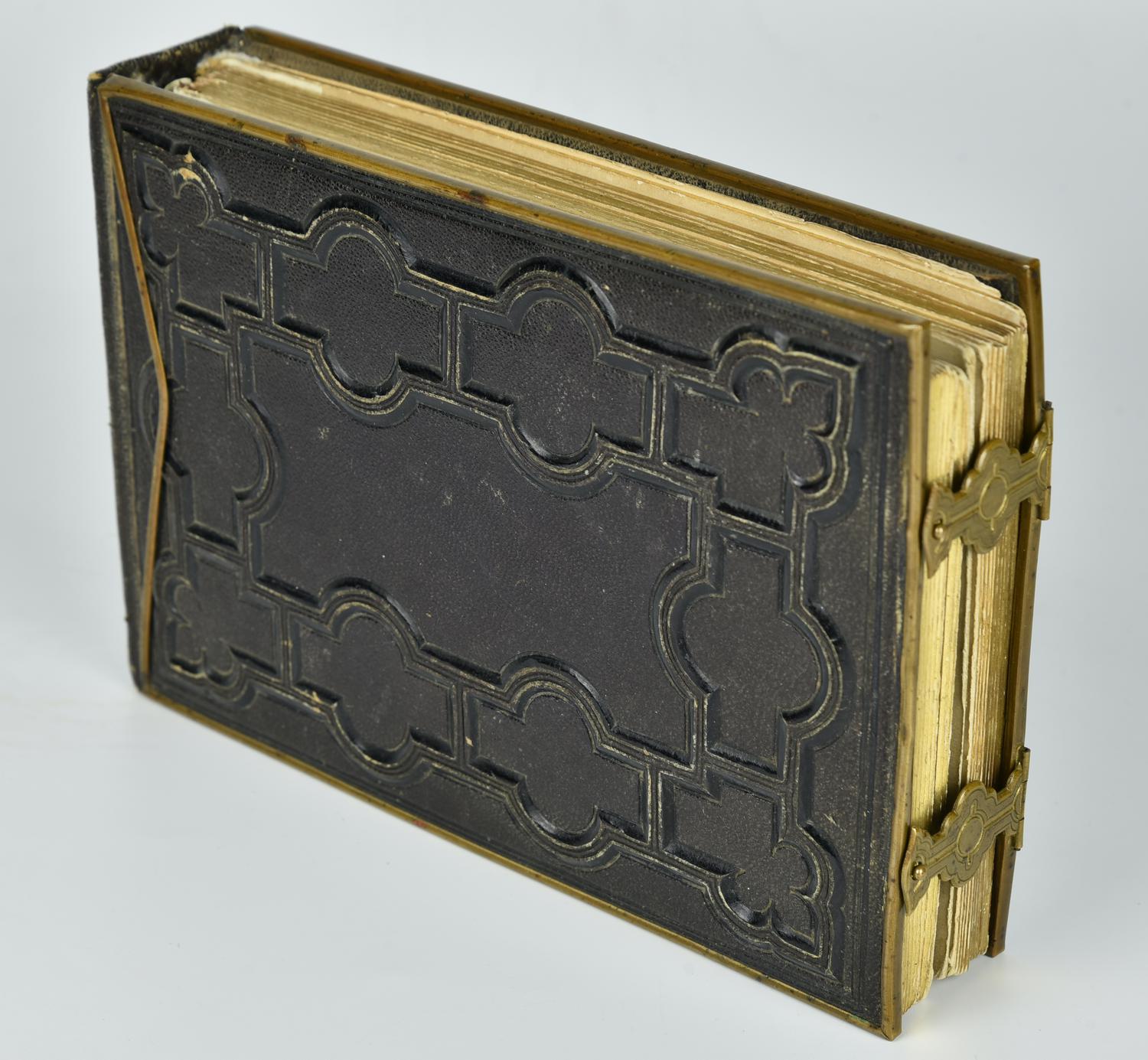 rilegatura in pelle con incisioni decorative e inserti in metallo dorato, cm 15,5x23