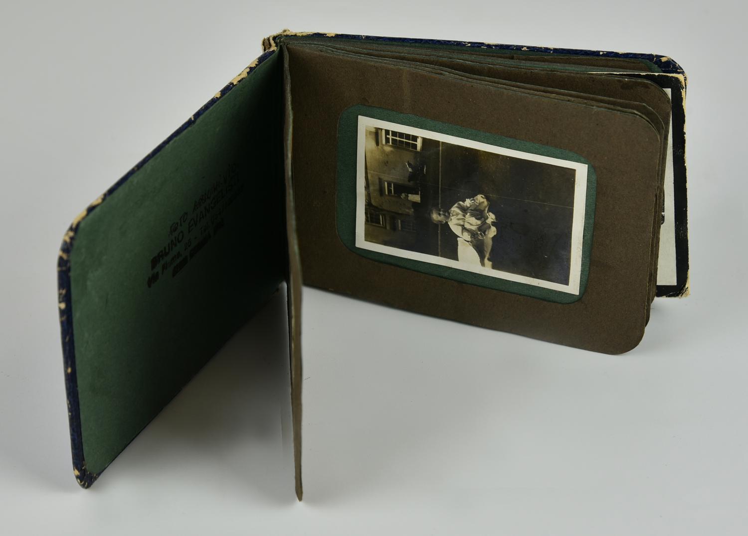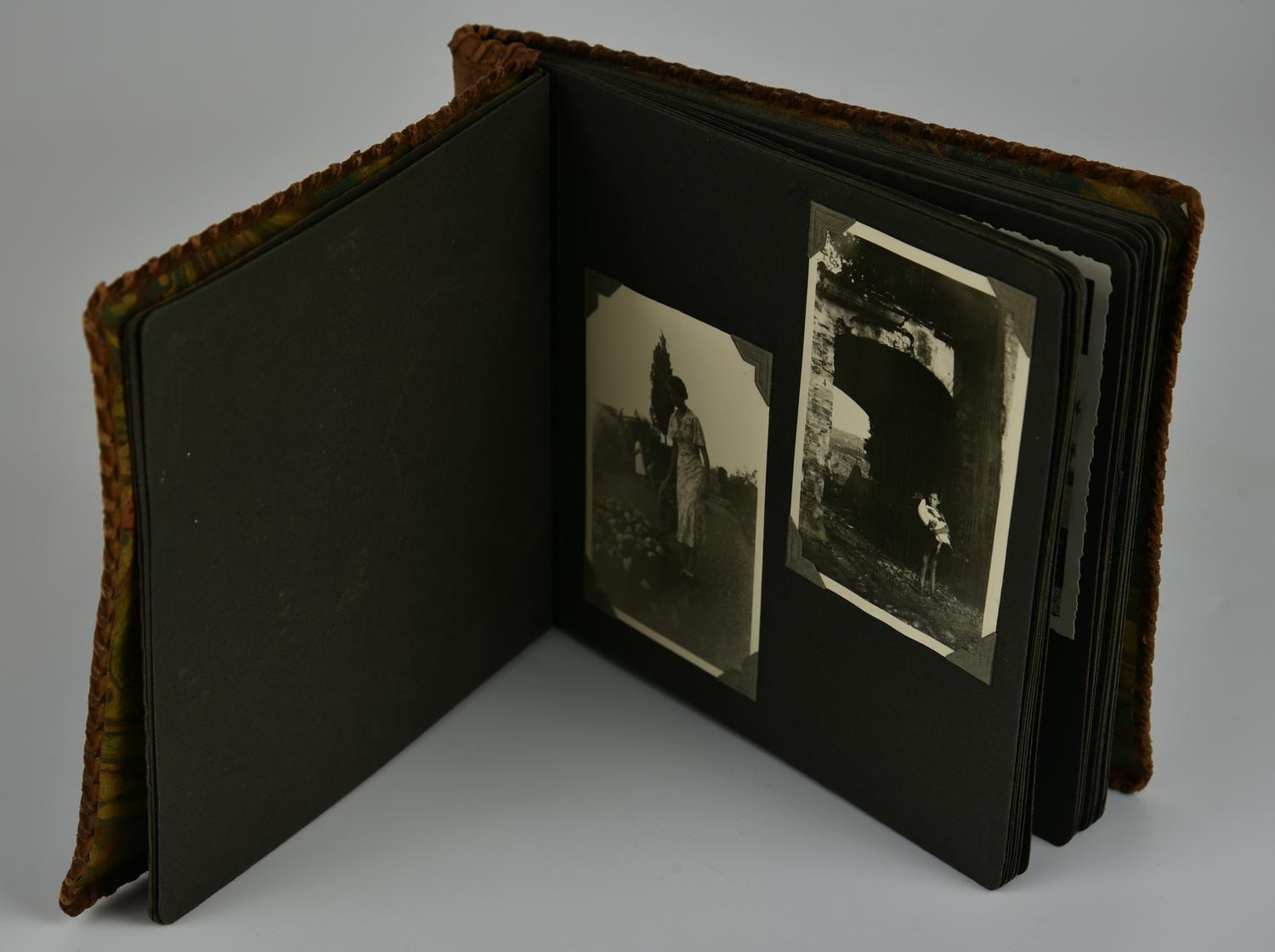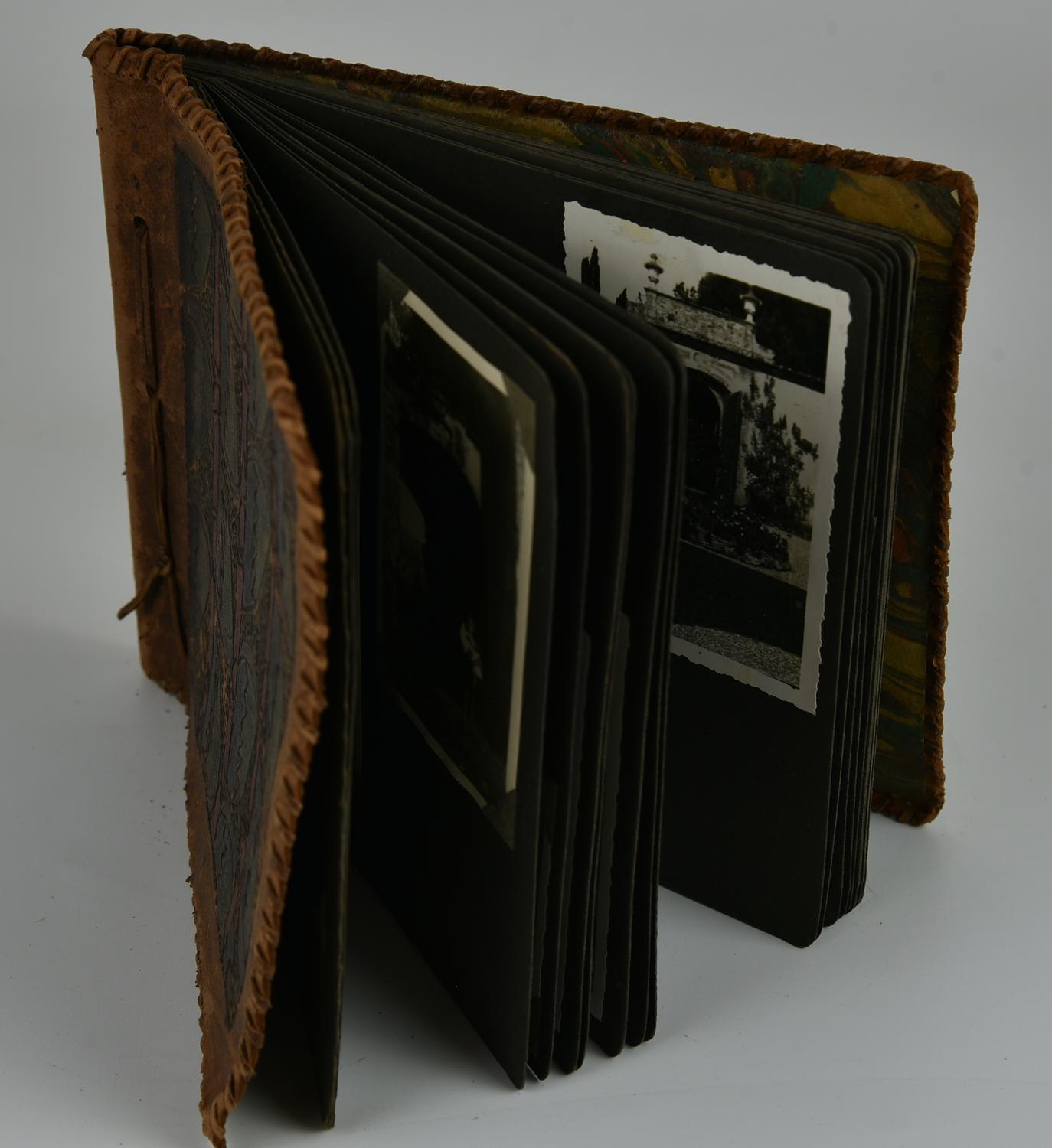 - album fotografico con rilegatura in pelle con inicisioni colorate, contentente fotografie amatoriali degli anni 20 del '900, cm 15x18 cm