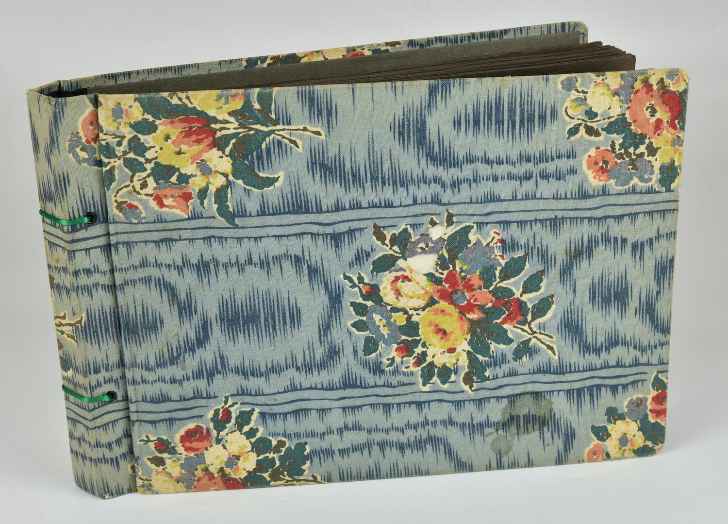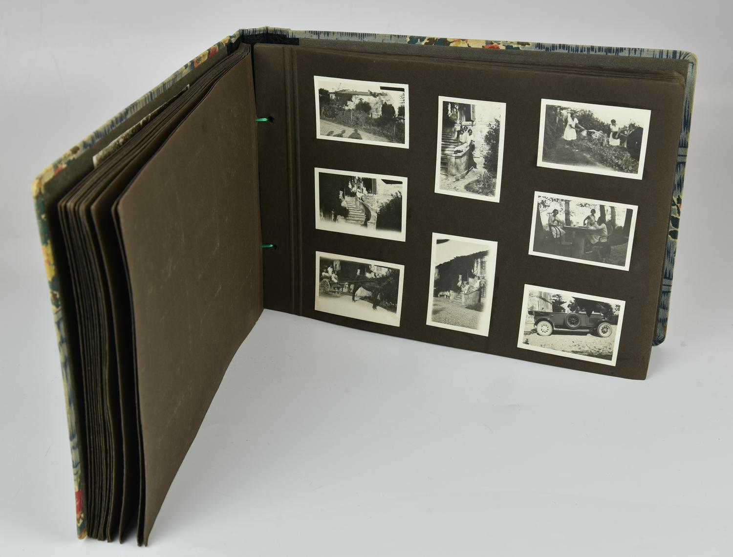 - album fotografico con rilegatura in stoffa floreale contenente fotografie amatoriali datate 1928, cm 20x28
