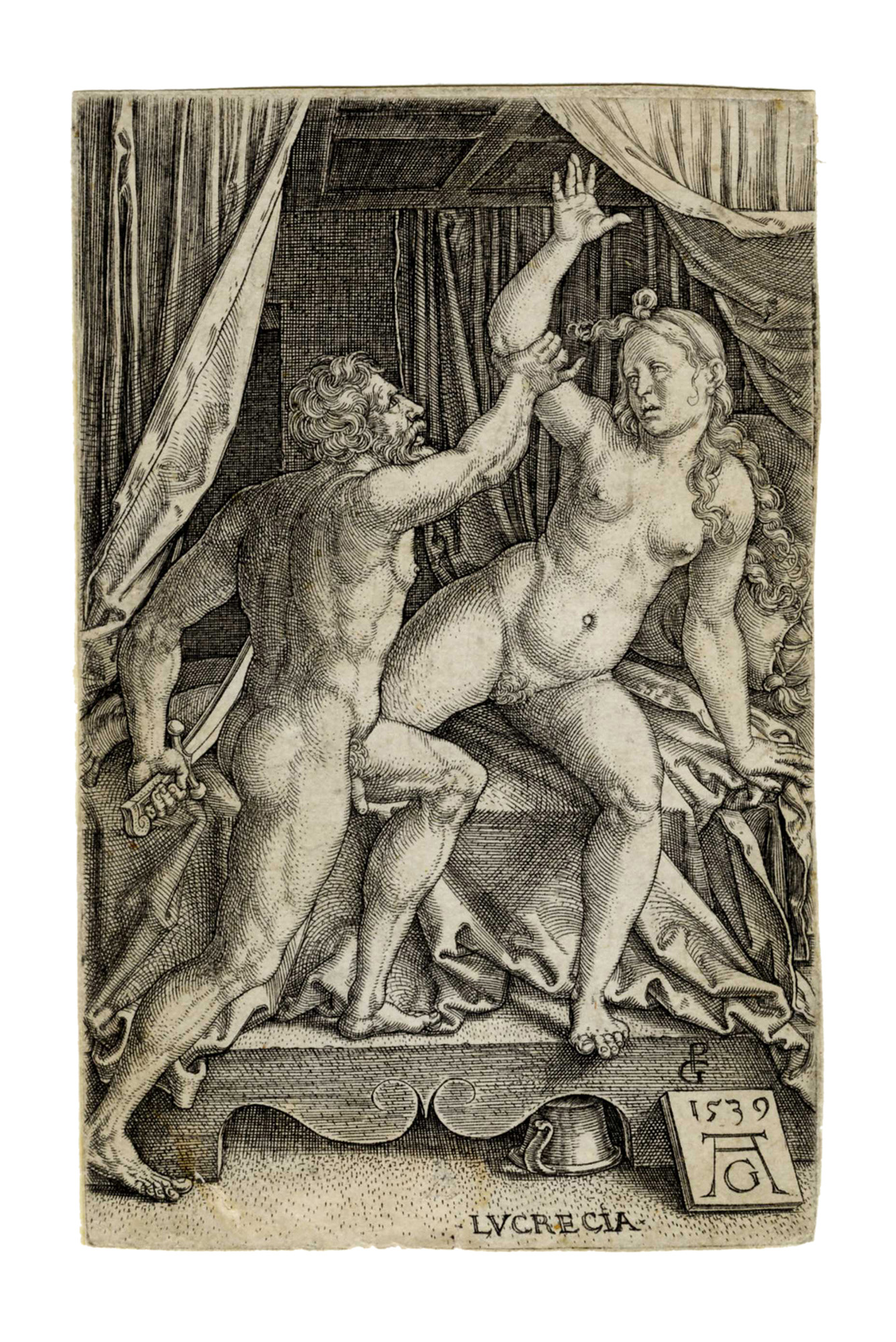 Bulino. mm 123x78. Bartsch, VIII, 63. New Hollstein, 63. Firmato con il monogramma di Aldegrever e datato "1539" sulla tavoletta in basso a destra. II stato di 2, dopo l'aggiunta del monogramma di Pencz autore dell'invenzione (il soggetto pare verosimilmente tratto da un disegno perduto) sopra la tavoletta con quello di Aldegrever. In basso al centro la scritta "LUCRECIA". Bella impressione di questa piccola e rara stampa, su carta vergellata sottile priva di filigrana. (1) Esemplare applicato lungo il margine sinistro, con nastro cartaceo, a cartone moderno e rifilato alla battuta del rame con sottilissimo margine visibile in alto, impronta visibile interamente a sinistra e a tratti a destra. Due minime fragilità in basso al verso.