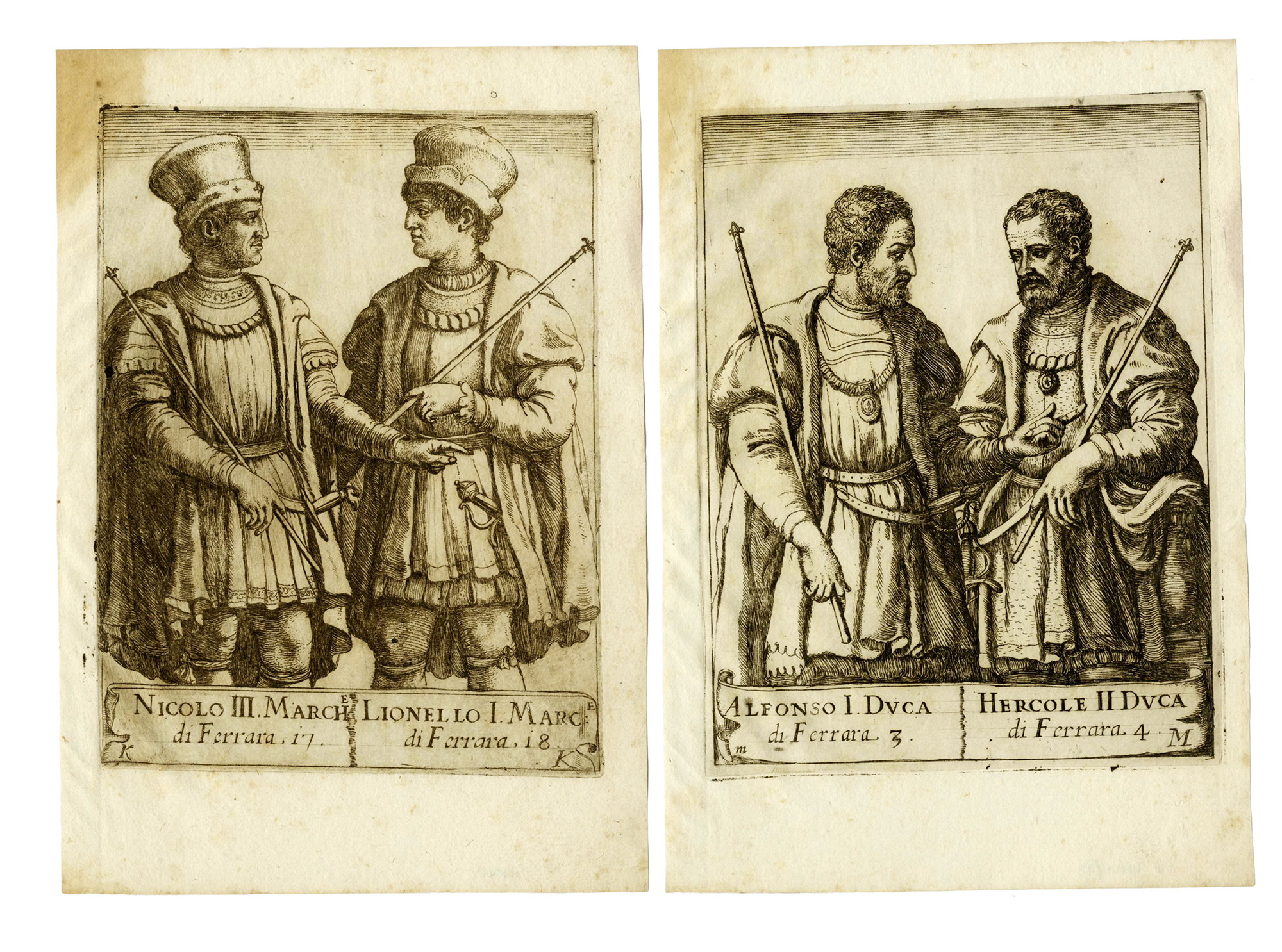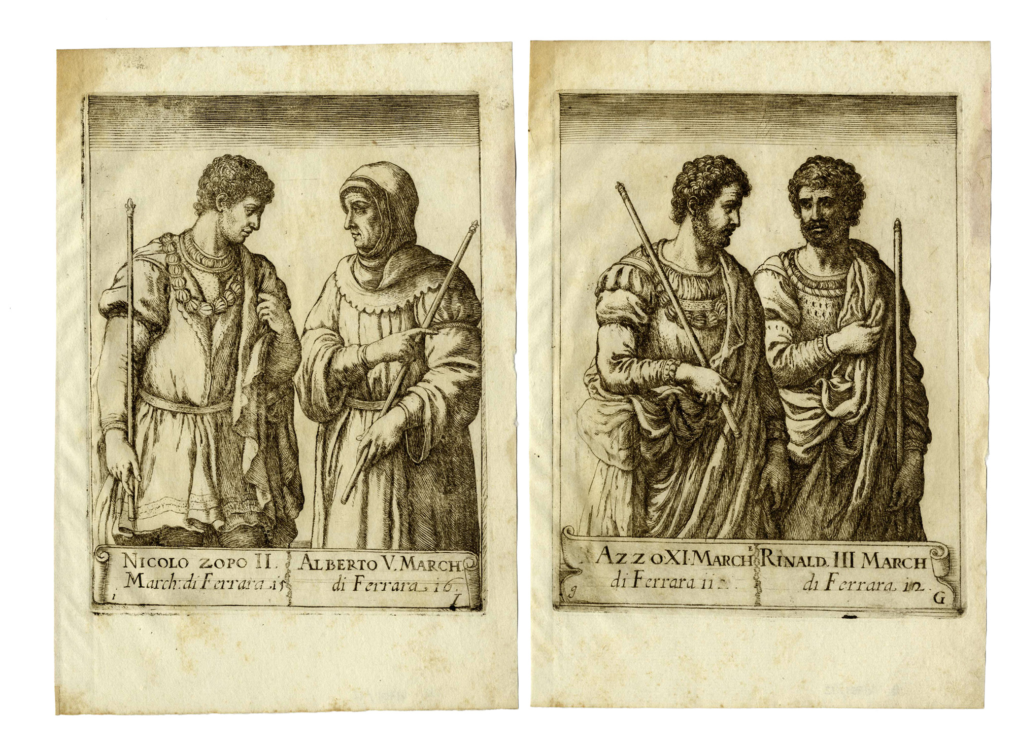 Acquaforte. mm 180/184x141.Foglio: mm 230x160. Bartsch, XX,11-23. TIB,44, pp. 351-363. Dodici tavole dall'opera riccamente illustrata sulla storia degli Este, signori di Ferrara. Dedicata al duca di Modena, è corredata nella sua veste completa da frontespizio e 13 incisioni ciascuna raffigurante due principi di Ferrara, accompagnate da sezioni biografiche scritte dallo storico Antonio Cariola. Nella prefazione, l'incisore ed editore Caterino Doino spiega che questo lavoro celebrativo fu intrapreso in età avanzata. L'autore trasse ispirazione dall'opera di Francesco Berni, Degli eroi della serenissima casa d'Este, ch'ebbero il dominio in Ferrara : memorie di Francesco Berni, In Ferrara: Per Francesco Suzzi stampator camerale,1640, illustrata con cinque ritratti (Almerico, Tedaldo I, Bonifacio III, Matilde e Azzo VIII). A questi Doino aggiunse, nei suoi Ritratti, Guglielmo Adelardi, Marchesella Adelardi, Aldovrandino II, Azzo IX, Obizzo IV, Azzo X, Francesco I, Azzo XI, Rinaldo III, Obizzo VII, Aldovrandino IV, Niccolò Zoppo II, Alberto V, Niccolò III, Lionello I, Borso I, Ercole I, Alfonso I, Ercole II, Alfonso II e Cesare I. Le tavole sono considerate una seconda edizione delle illustrazioni de' prencipi d'Este (1640) dello stesso Doino, una serie di stampe, che differiscono solo per la numerazione rivista, e prive del testo storico. Una proposta attributiva per la realizzazione delle acqueforti a Giuseppe Caletti sembra non essere più accolta ad oggi. Tutti i ritratti sono vagamente basati sugli affreschi di Faccini nel Castello di Ferrara.