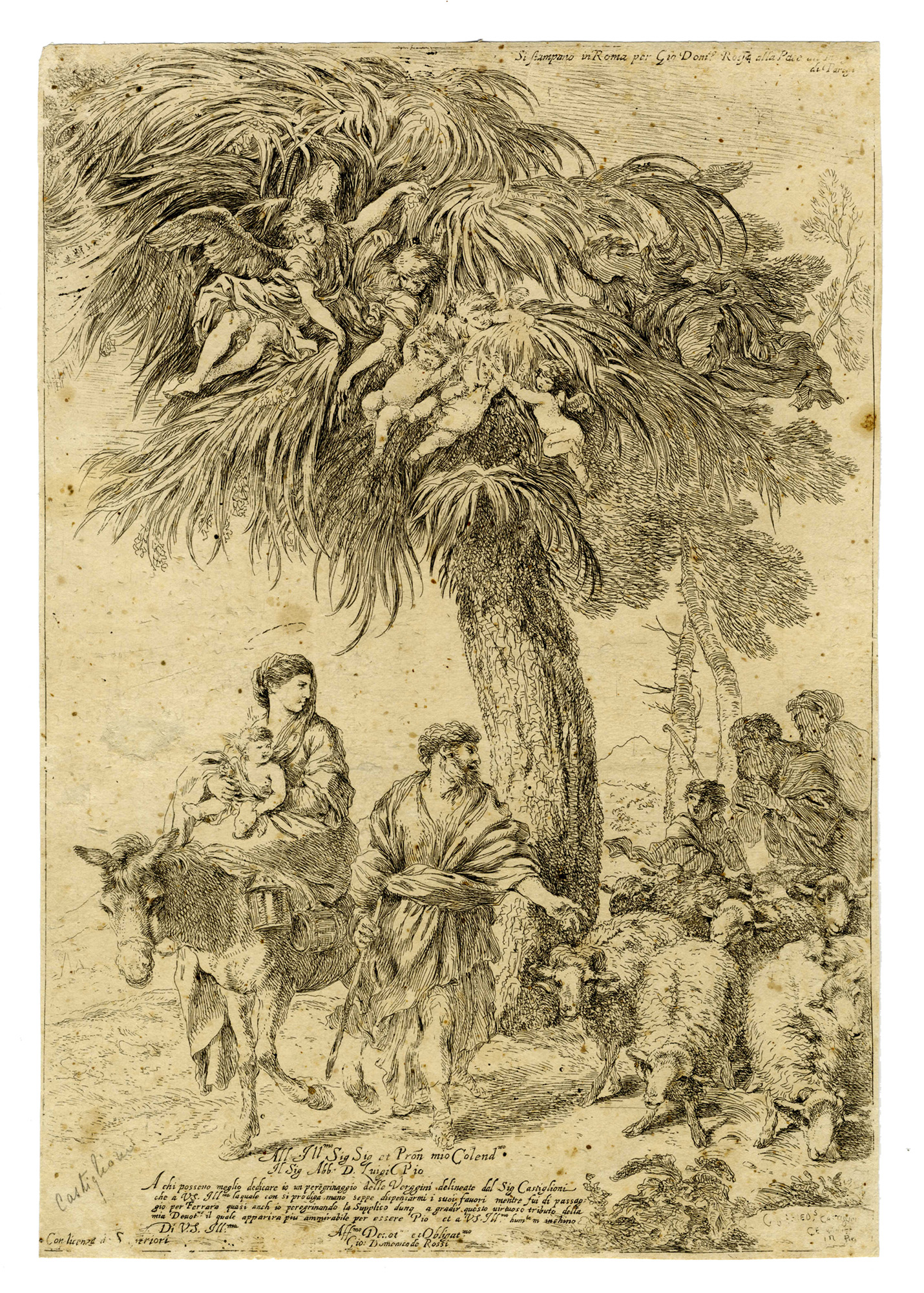 Acquaforte. mm 300x208. Bartsch, XXI, 12. Bellini (castiglione), 20. Con la firma sulla lastra in basso a destra "Gio Bened Castiglione Genovese in pin", e con otto righe di dedica di Giovanni Domenico Rossi a Luigi Pio, più in basso "con licenza de' superiori". Lungo il margine superiore a destra "Si stampano in Roma per Gio Dom Rossi alla Pace all'insegna di Parigi". Buona prova ancora ben leggibile nel III stato di 4, prima della comparsa del danno sulla lastra all'angolo inferiore destro. Carta vergellata spessa. (1) Esemplare rifilato alla linea d'inquadramento con sottile margine. Lievi punti di fioritura e minima traccia di piega orizzontale. Due piccoli residui di carta al verso. Segni d'uso