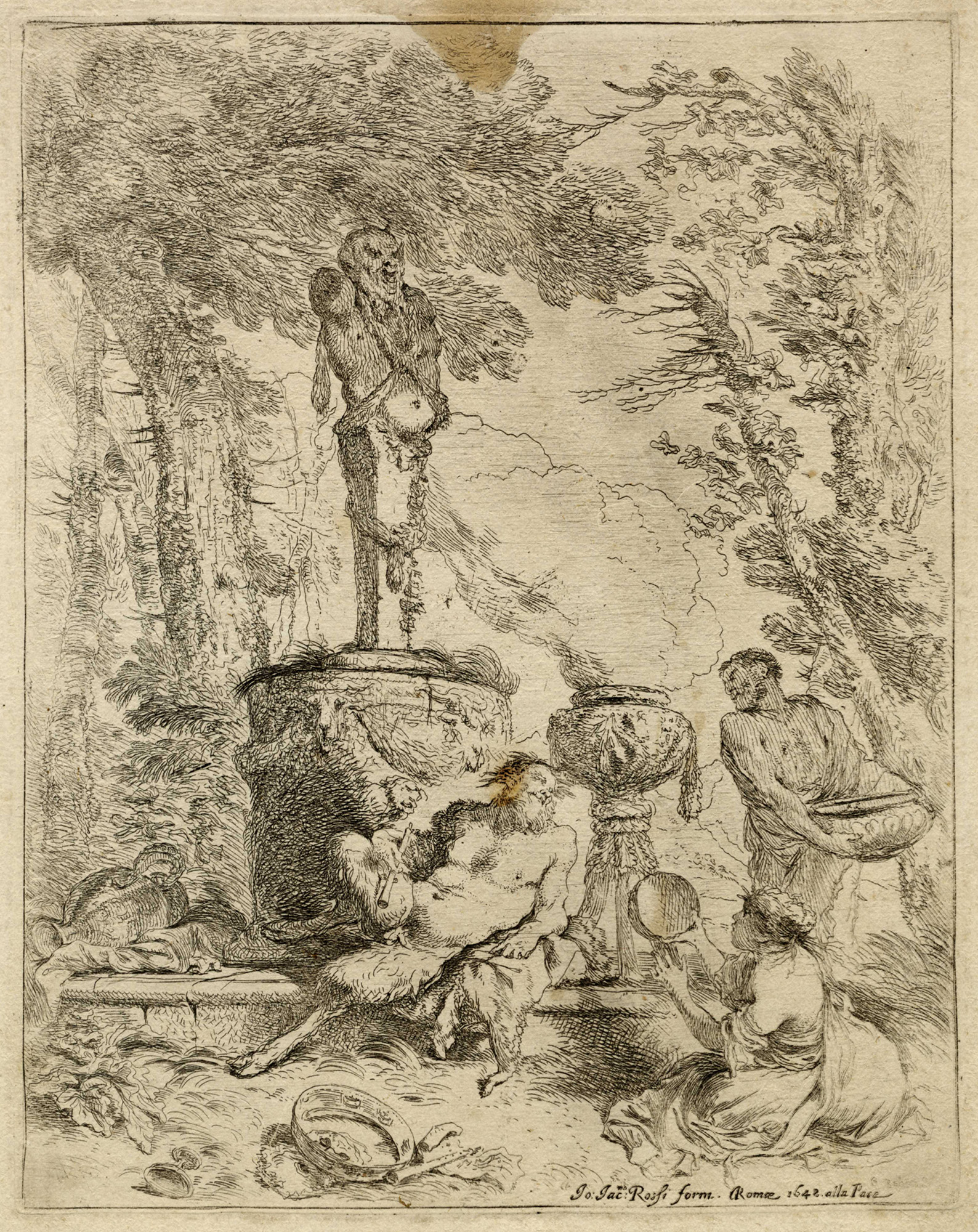Acquaforte. mm 232x184. Foglio: mm 245x195. Bartsch, XXI, 16. Bellini (castiglione), 10. Con la firma a stento visibile sulla lastra in basso a destra "G. BENED.TO CAS./P", e con più in basso "Io: Iac:mo Rossi form. Romae 1648 alla Pace". Buona prova ancora ben leggibile nel III definitivo stato di 3, su carta vergellata spessa. (1) Margini di 5/7 mm oltre la battuta del rame. Foglio applicato lungo il lato sinistro a cartoncino moderno. Lieve macchia bruna in alto al centro, alcune tracce d'uso.