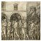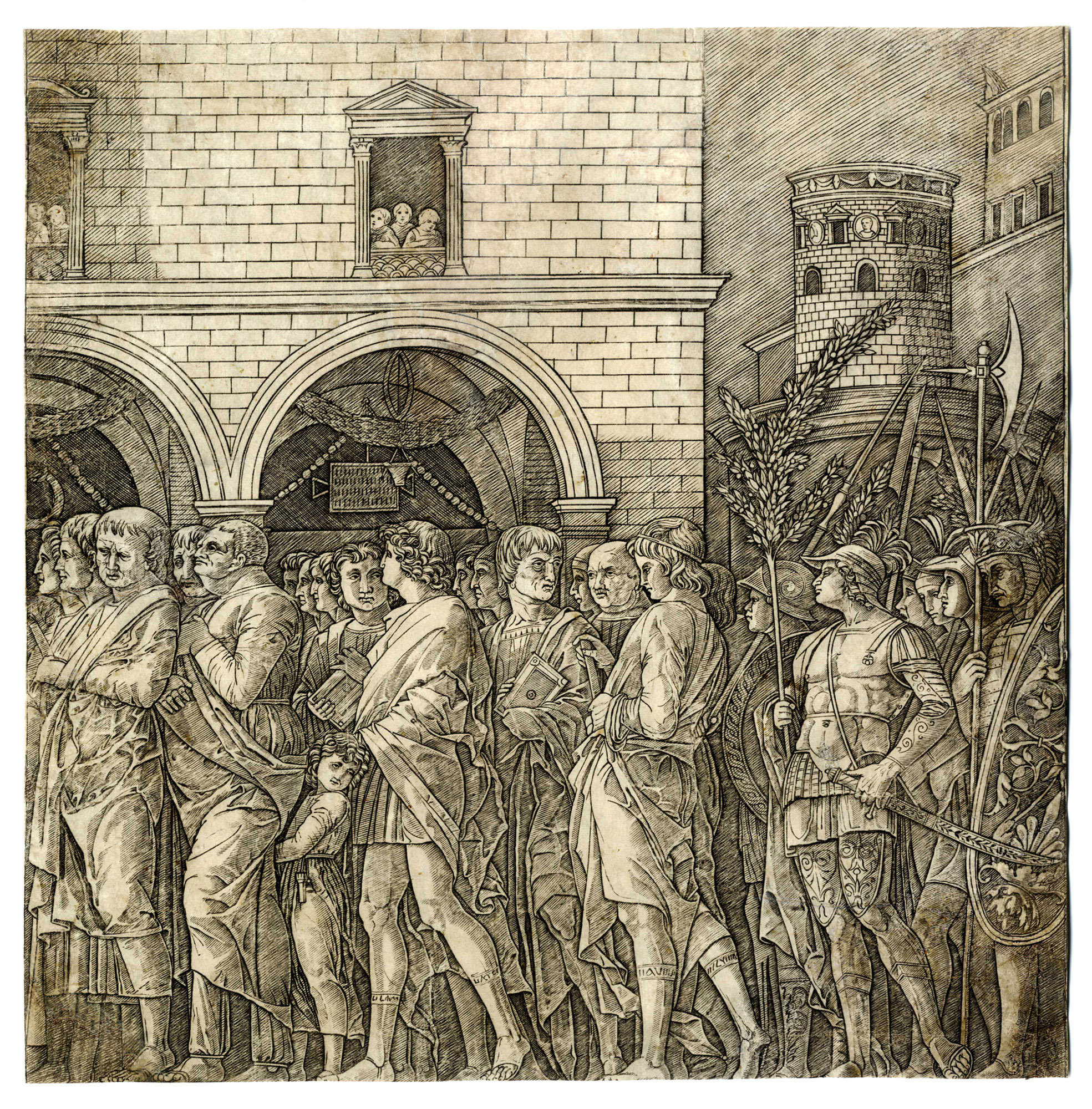 Bulino. mm 273x267. Bartsch, XIII, p. 321, n. 7 e p. 235, n. 11. Hind, 1948, V, 25-16a. Martineau, 127. Copia in controparte dal Primo incisore di Andrea Mantegna. Questa incisione fa parte di un gruppo di stampe di ugual formato, derivanti da disegni (di ben tre mani diverse) tratti dai preparatori autografi e perduti, per il ciclo in nove grandi tele dedicato da Mantegna ai Trionfi di Cesare, oggi conservato a Hampton Court. Sono state individuate sette composizioni incise, attribuite alla cerchia di Mantegna, relative a due (Gli elefanti e I portatori di corazze) dei nove episodi realizzati e a un decimo (I senatori) mai eseguito. Questa scena riproduce il decimo episodio, assente nel ciclo dipinto, copiata da Giovanni Antonio dal medesimo soggetto inciso dal Primo incisore (Martineau, 126). Si veda anche il disegno in controparte conservato all'Albertina in Vienna (inv. 2585; Martineau, 125). Raro foglio offerto in un'impressione ancora ben definita su sottile carta vergellata con filigrana in piccolo cerchio singolo non completamente identificabile. (1) Esemplare rifilato alla linea d'inquadramento parzialmente visibile su due lati, e di poco all'interno sui restanti. Presenza di vecchio restauro ben eseguito per riparare danni da distacco (abrasioni e alcune fratture).