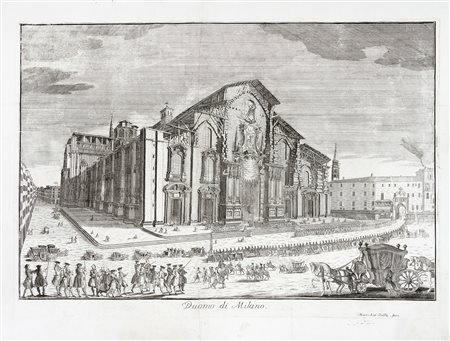 Acquaforte e bulino. mm 434x625. Foglio: mm 520x680. Incisione del 1735 realizzata in occasione dei funerali della regina di Sardegna Polissena d'Assia, che offre molte indicazioni sullo stato di costruzione del Duomo di Milano. Sulle coperture è visibile ancora il piccolo campanile mentre sullo sfondo sono presenti solamente due guglie delle 135 oggi esistenti: la cosiddetta guglia Carelli e il gugliotto Amadeo. La facciata è ancora completamente in costruzione ed è possibile vedere le diverse fasi di realizzazione dei lavori: il mattone nudo nella parte alta e sulla destra, la facciata marmorea in stile barocco iniziata dal Tibaldi sulla sinistra e la nuova facciata del Soave (quella attuale) nella zona centrale. (1) Foglio integro con margini come in origine. Segno di giunzione in verticale al centro. Traccia di altre pieghe.