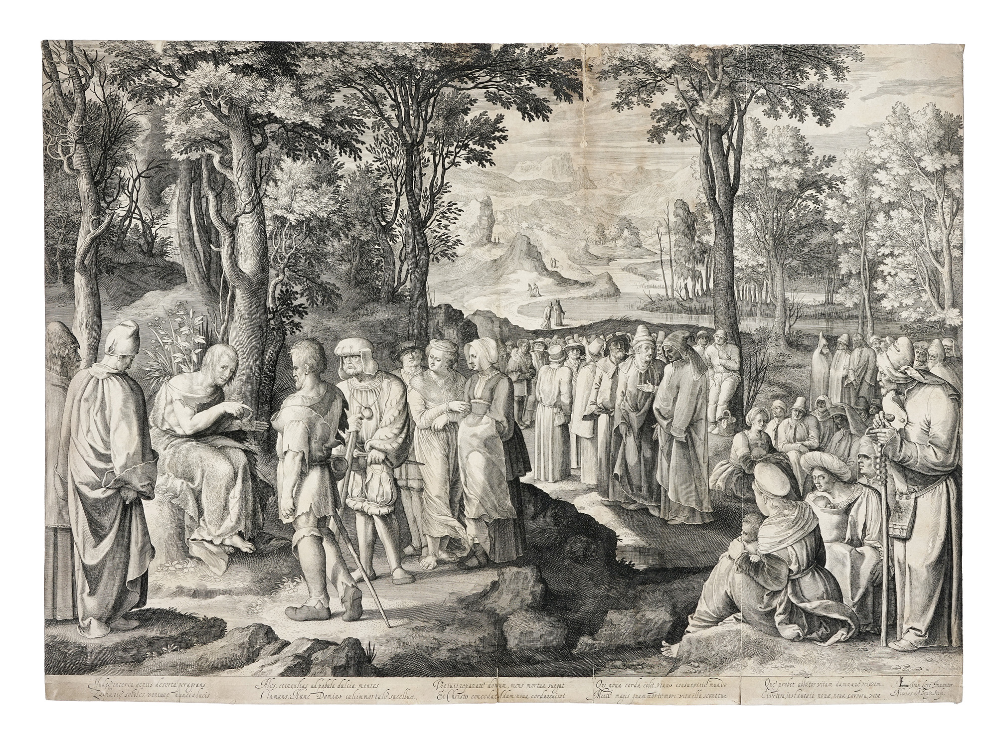 Bulino. mm 395x547. Hollstein, 116. New Hollstein, 71. Provenienza: famiglia Natanson. Da Aertgen Claesz. van Leyden o Lucas van Leyden. Bella impressione nel II stato di 5 dopo la modifica della scritta in basso a destra da "Aert ven L. In" in "L. van Leye. Inventor Nicolas de Bruyn sculp." su carta vergellata lievemente spessa. Al verso marchio "Doublette der Kunsthalle Bremen" (Lugt, 293). (1) Rifilata all'interno dell'impronta del rame. Pieghe e strappi riparati con carta al verso, segni d'uso. Difetti.