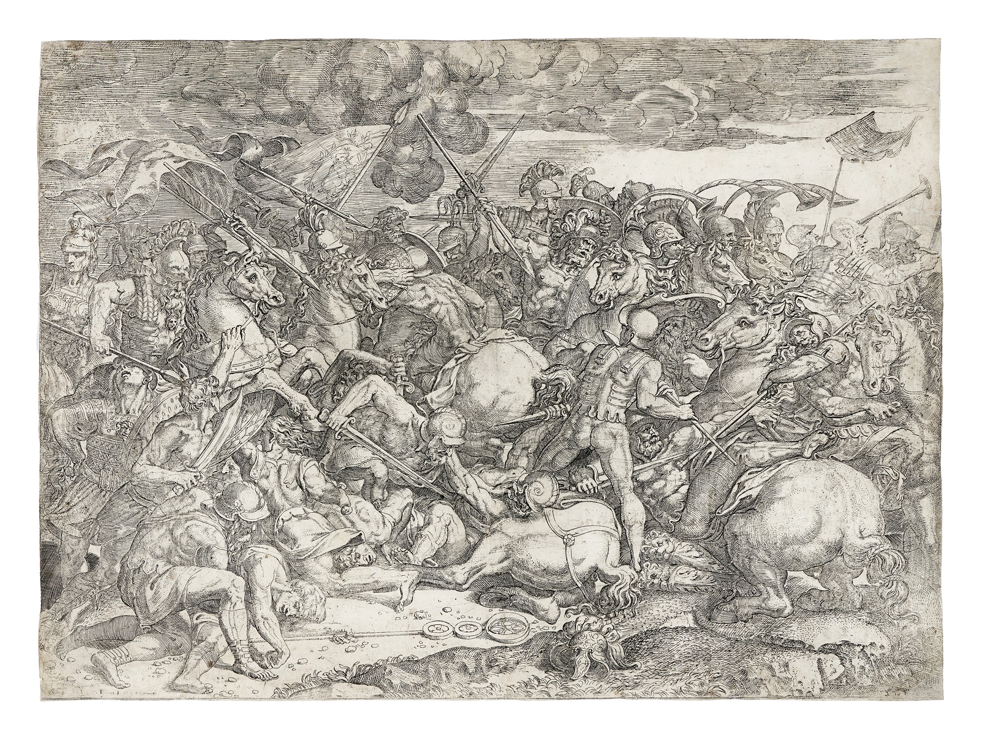 Acquaforte. mm 403x550. Bartsch, XVI, 37. Massari (raphael invenit), p.113,II,2. Il combattimento raffigura la sola parte sinistra della Battaglia di Ponte Milvio affrescata nella Sala di Costantino dei Palazzi Vaticani. L'acquaforte non è comunque tratta dall'affresco ma dal cartone di Giulio Romano all'Ecole des Beaux Arts di Parigi (inv.2773). Variamente attribuita anche a Orazio Farinati, la critica più recente sembra tuttavia assegnare l'incisione, per la condotta sicura e il sapiente uso del chiaroscuro, a Battista del Moro. Buona prova su carta vergellata pesante con filigrana "fiore di giglio in cerchio singolo sormontato da grande corona". (1) Esemplare rifilato alla linea d'inquadramento. Traccia di piega verticale al centro. Minimi residui di carta al verso e lievi segni d'uso.