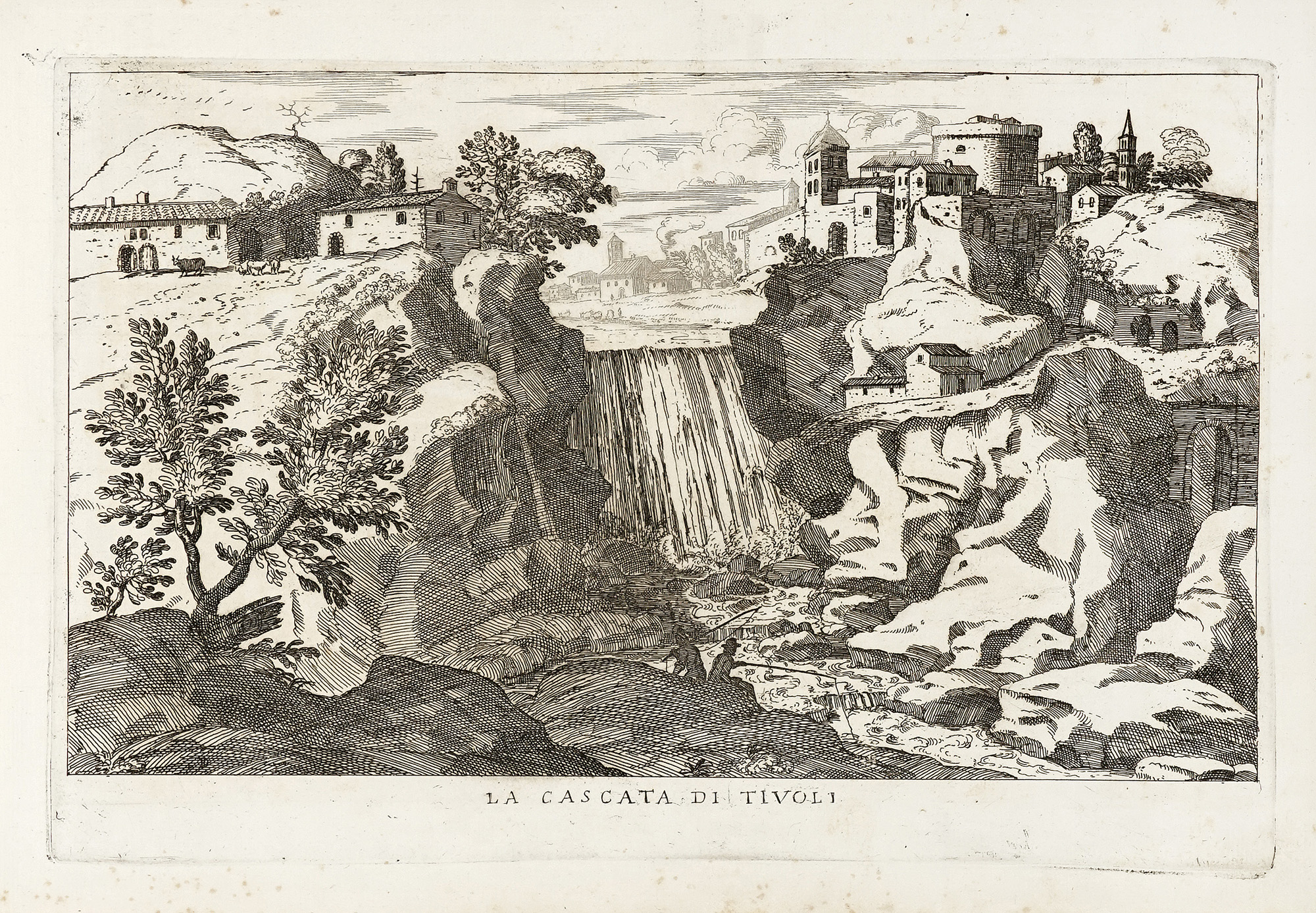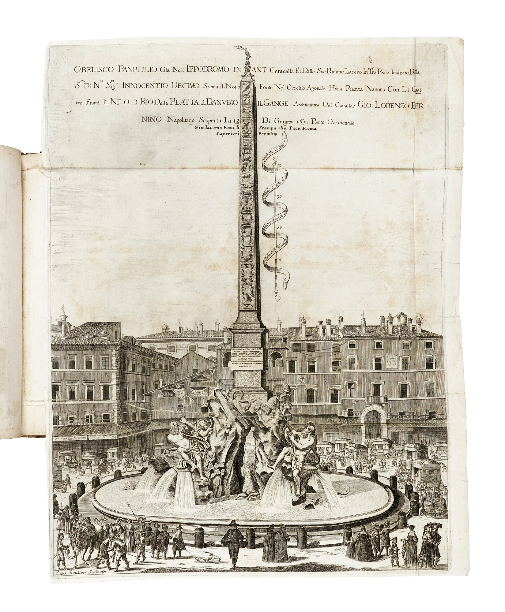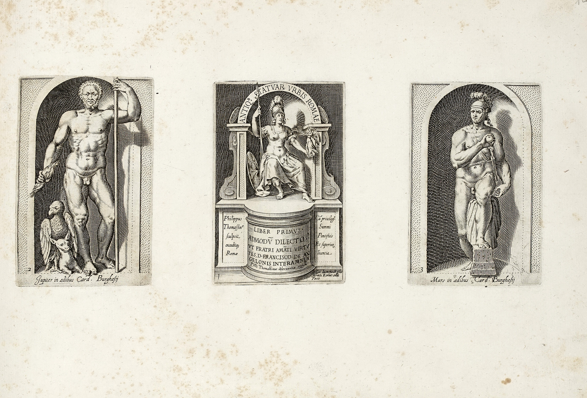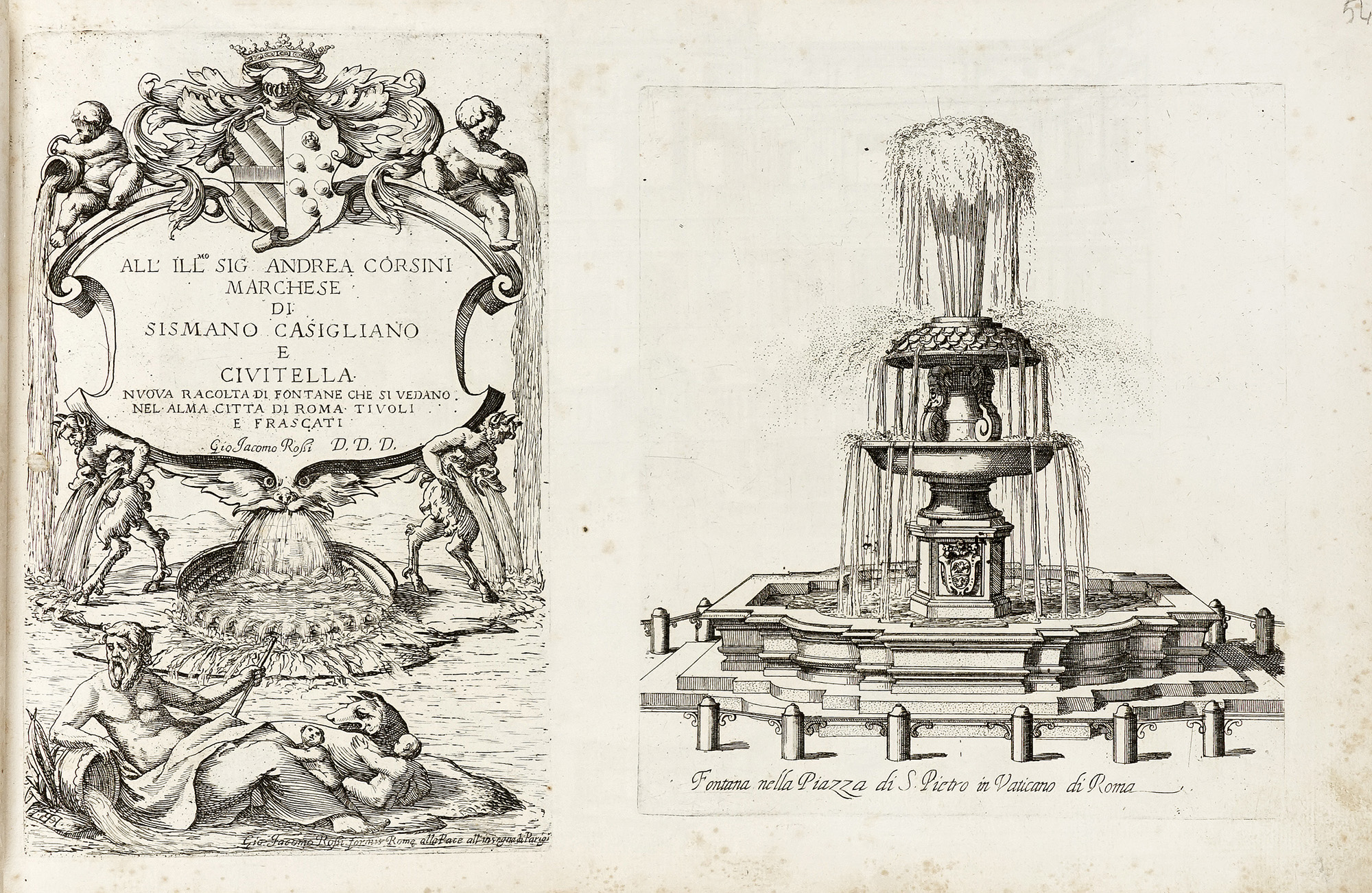 In-4° oblungo (mm 275x413). Album con legatura in piena pergamena. Composizione: Ritratto di Clemente IX; G. B. Falda. 1662. Tavola ripiegata Disegno delle fabbriche prospettive e piazze fatte novamente in roma d'ordine della S.ta: di N.S. Papa alessandro VII; Frontespizio figurato inciso; 50 tavole calcografiche non numerate. LEGATO CON: Nuova racolta di fontane che si vedano nel alma citta di Roma, Tivoli e Frascati, Gio. Jacomo Rossi [1678]. Frontespizio e 27 tavole alcune con 2 incisioni su ciascun foglio. / Nova racolta degl'obelischi et colonne antiche, dellalma ciità di Roma con, le sue dichiaratione date in luce, da Gio'. Iacomo Rossi alla Pace Roma. Frontespizio e 9 tavole con 2 incisioni su ciascun foglio. / Egidius Sadeler, Vestigi delle antichità di Roma Tivoli Pozzuolo et altri luochi. 1606. Marco Sadeler excudit. Si stampano adesso in Roma da Gio Iacomo de Rossi alla pace Al in segna di Parigi, 1660. Frontespizio e 50 tavole numerate da 1 a 50 compresa la lettera dedicatoria. / Philippe Thomassin, Antiq.r Stauar Urbis Romae Liber Primus, 35 tavole compreso frontespizio con 2 o 3 incisioni su ciascun foglio./ Otto grandi tavole ripiegate: 1) Antiquae Urbis perfecta et nova delineatio. 2) Urbis Romae novissima delineatio MDCL. 3) Le sette chiese di roma con le loro principali reliquie stationi et indul.tie. 4) Romani pontificis publicae et solennes actionis, 1664. 5) La cavalcata con le sue cerimonie del pontefice nuovo quando piglia/il possesso a santo Giovanni Laterano. 6) Molis aenae quam fusili artificio Urbanus VIII Pont.Max. super S.S. Aposr Petri et Pauli Tumulum excitavit, ornavique, Ioannes Laurentius Berninus Eques... 7) Urbani VIII Barberini Florent. Pont. Max. in Vaticano Tumulum excitavit et ornavit Ioannes Laurentius Berninus Eques. 8) Nuovo disegno dell'ordine tenuto nella solenne cavalcata dal Palazzo Vaticano alla Basilica lateranense per il possesso preso da N. S. Papa Clemente XII il di XIX novembre MDCCXXX. (1) Legatura con alcune piccole macchie al piatto anteriore, alcune spellature agli angoli superiori. Fogli con margini come in origine. Rari strappi riparati al verso con nastro cartaceo, lieve ingiallimento e traccia di fioriture, per lo più localizzate alle estremità, su alcune tavole. Sporadici forellini di tarlo. Minori difetti.