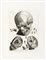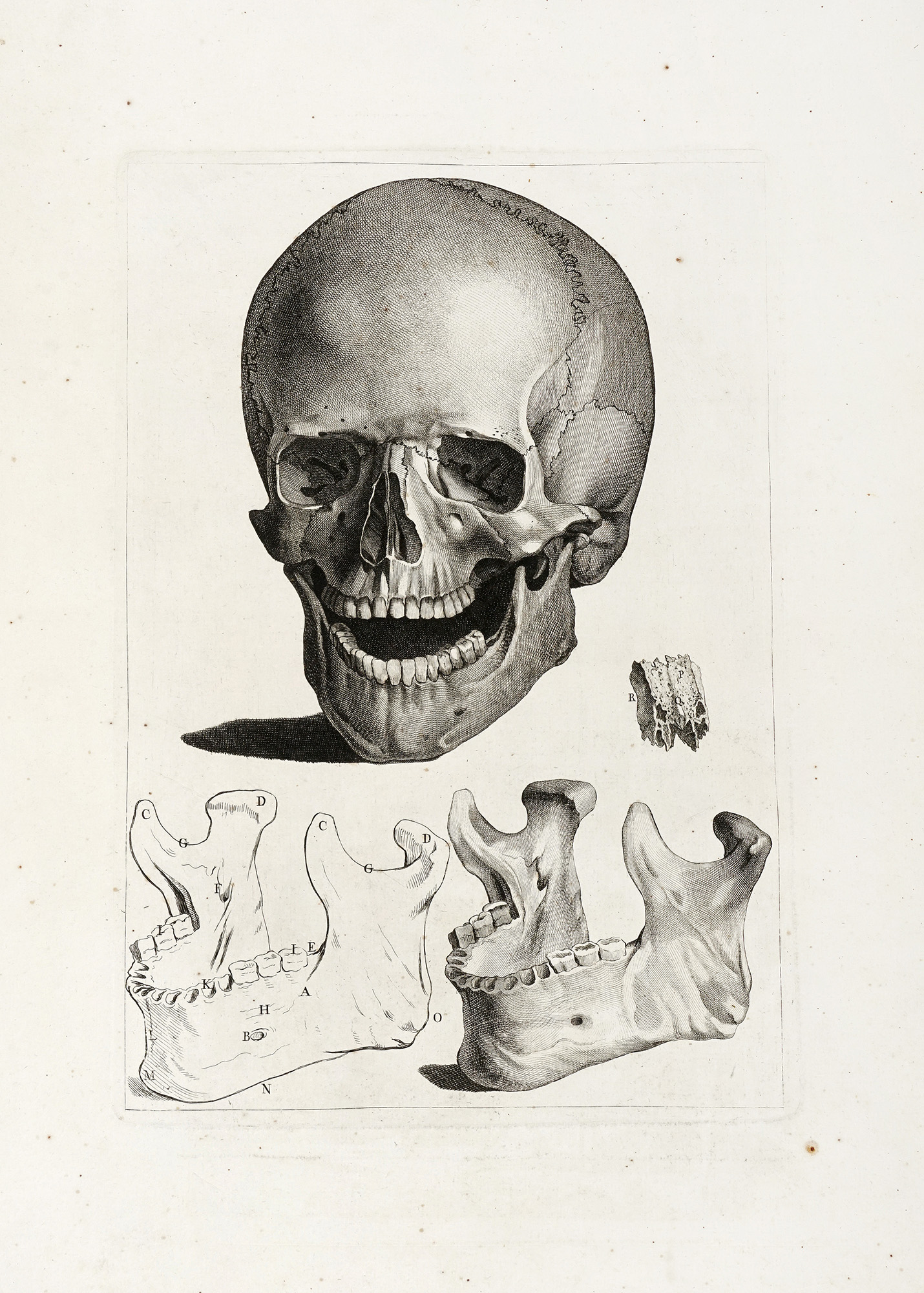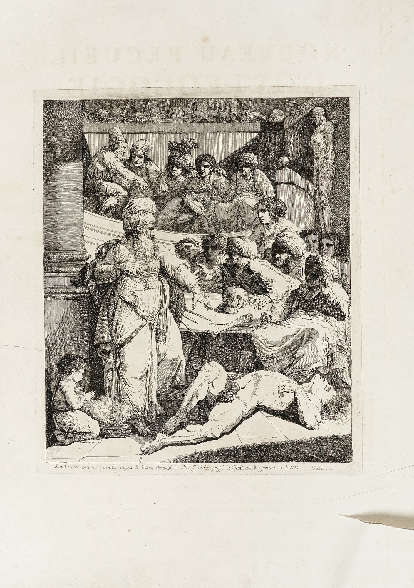 Acquaforte. mm 185/353x230/250. Foglio: mm 518x388. Lotto composto da: tavola di frontespizio con Lezione di anatomia datata 1778. Titolo inciso (con suggestiva vignetta raffigurante la Morte sul campo di battaglia con la data 1778), Prospectus inciso (raro), due grandi illustrazioni fuori testo su foglio integro e una piccola, raffiguranti il cranio e le sue ossa. Tutte le tavole provengono da Nouveau Recueil d'Ostéologie et de Myologie, dessiné d'après nature par Jacques Gamelin de Carcassonne, Professeur de Peinture, de l'Académie de Saint Luc de Rome, pour l'utilité des sciences et des arts,..., suggestiva opera illustrata che vide una sola edizione e composta da due frontespizi, un ritratto, 82 tavole a piena pagina e 11 vignette inserite nel testo. Per realizzare la sua opera dedicata all'osteologia e alla miologia, Gamelin aveva allestito un laboratorio di dissezione a Tolosa, dove disegnava e incideva lui stesso le sue composizioni anatomiche fantastiche con l'aiuto di due dei suoi migliori allievi Martin e Lavallée. Alcune acqueforti recano motti incisi e rappresentano originalissimi memento mori. (6) Fogli grandi integri con margini come in origine. La tavola più piccola inserita nel testo e ritagliata ma comunque con ampi margini. Strappo al margine destro della tavola con la Lezione di anatomia. Segni di legatura a lato.