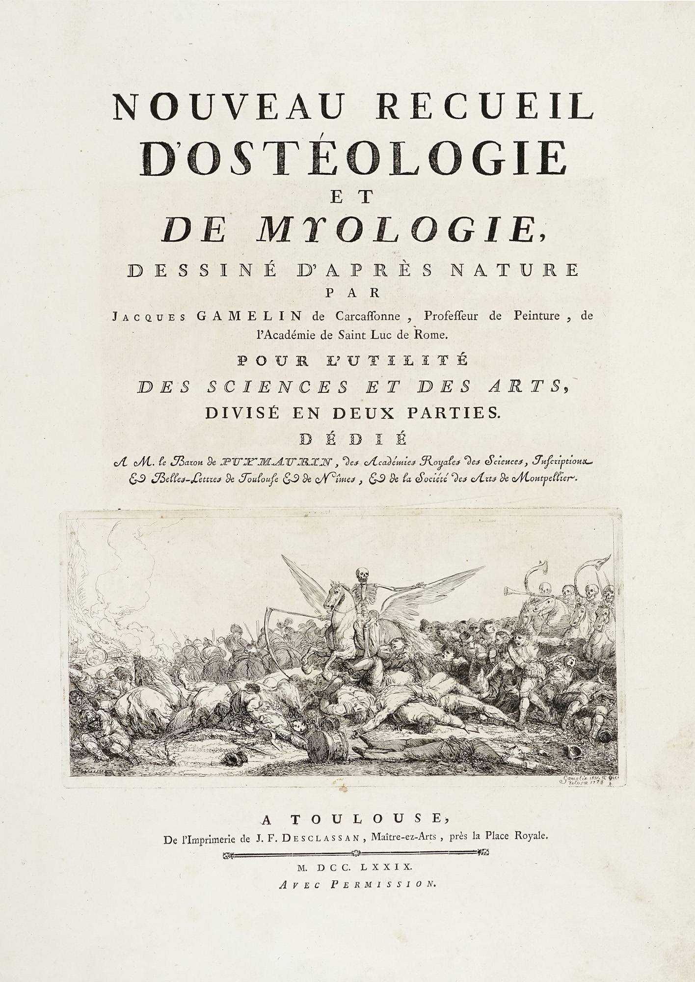 Jacques Gamelin, Sei tavole da Nouveau Recueil d'Ostéologie et de Myologie, dessiné d'après nature par Jacques Gamelin de Carcassonne, Professeur de Peinture, de l'Académie de Saint Luc de Rome, pour l'utilité des sciences et des arts,... A Toulouse: Imprimerie de J. F. Desclassan, MDCCLXXIX [1779].