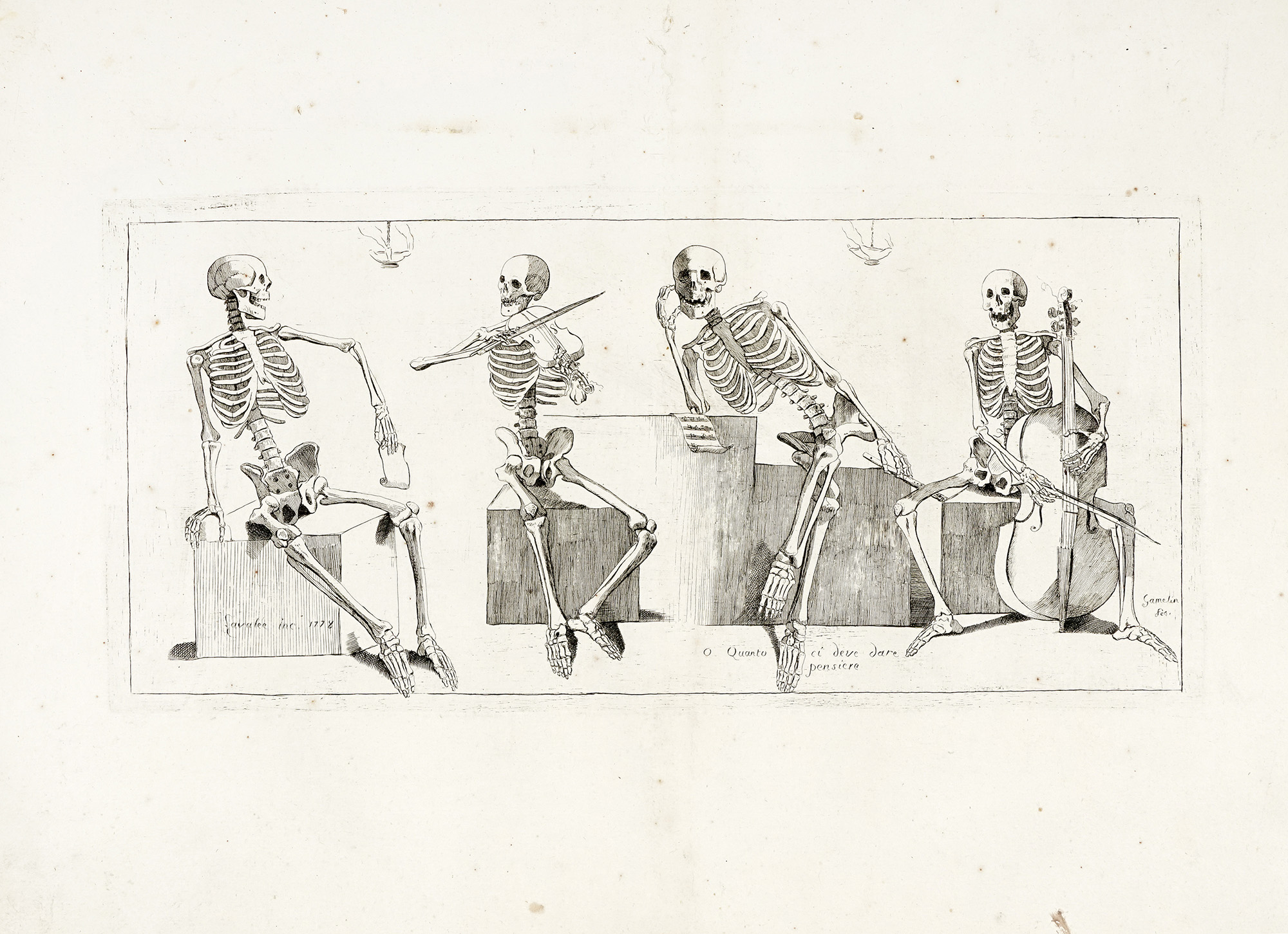 Acquaforte. mm 195x410. Foglio: mm 388x520. Grande tavola di memento mori firmata sulla lastra a sinistra "Lavallee inc. 1778", da Nouveau Recueil d'Ostéologie et de Myologie, dessiné d'après nature par Jacques Gamelin de Carcassonne, Professeur de Peinture, de l'Académie de Saint Luc de Rome, pour l'utilité des sciences et des arts,..., suggestiva opera illustrata che vide una sola edizione e composta da due frontespizi, un ritratto, 82 tavole a piena pagina e 11 vignette inserite nel testo. Per realizzare la sua opera dedicata all'osteologia e alla miologia, Gamelin aveva allestito un laboratorio di dissezione a Tolosa, dove disegnava e incideva lui stesso le sue composizioni anatomiche fantastiche con l'aiuto di due dei suoi migliori allievi Martin e Lavallée. Alcune acqueforti recano motti incisi e rappresentano originalissimi memento mori. (1) Foglio integro con margini come in origine. Alcuni punti di fioritura. Traccia di legatura al margine superiore.