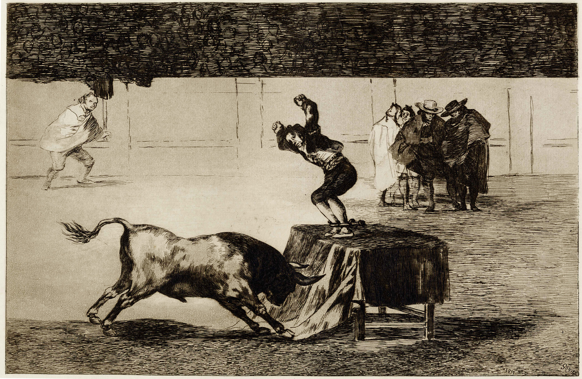 Acquaforte, acquatinta brunita, puntasecca e bulino. mm 245x352. Foglio: mm 330x475. Harris, 222. Con il numero "19" in alto a destra. Diciannovesima tavola dalla Tauromachia, serie pubblicata per la prima volta da Goya nel 1816 in trentatrè tavole, alle quali dalla III edizione (curata nel 1876 da Loizelet) se ne aggiugono altre sette contraddistinte da A a G e inizialmente rifiutate dall'autore, portando a quaranta il numero totale delle incisioni nella serie. Bellissima impressione dalla III edizione di 7, pubblicata nel 1876 da Loizelet, su carta vergellata sottile con parte di filigrana "Arches". Al verso in basso marchio della collezione di Charles Deering (Lugt, 516). (1) Esemplare inserito per due punti in alto entro vecchio montaggio. Margini come in origine con parziale lieve ingiallimento da passe-partout. Due forellini agli angoli in alto.