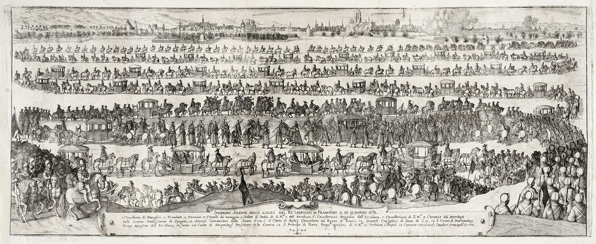 Bulino su due lastre. mm 300x758. Foglio: mm 345x804. Tavola celebrativa tratta da Galeazzo Gualdo Priorato, Historia di Leopoldo Cesare..., Vienna 1670-1674. Il soggetto è ripreso dalla tavola edita dagli Eredi di Matthäus Merian in Martin Meyer, Theatri Europaei Achter Part (Theatrum Europaeum), Francoforte sul meno, 1667. Bellissima impressiona nitida e brillante su sottile carta vergellata apparentemente priva di filigrana. (1) Esemplare con margini come in origine su tre lati, reintegrato il sinistro. Al centro presenza della giunzione tra i due fogli. Alcune minime pieghe di stampa e traccia di altre da inserimento in volume.